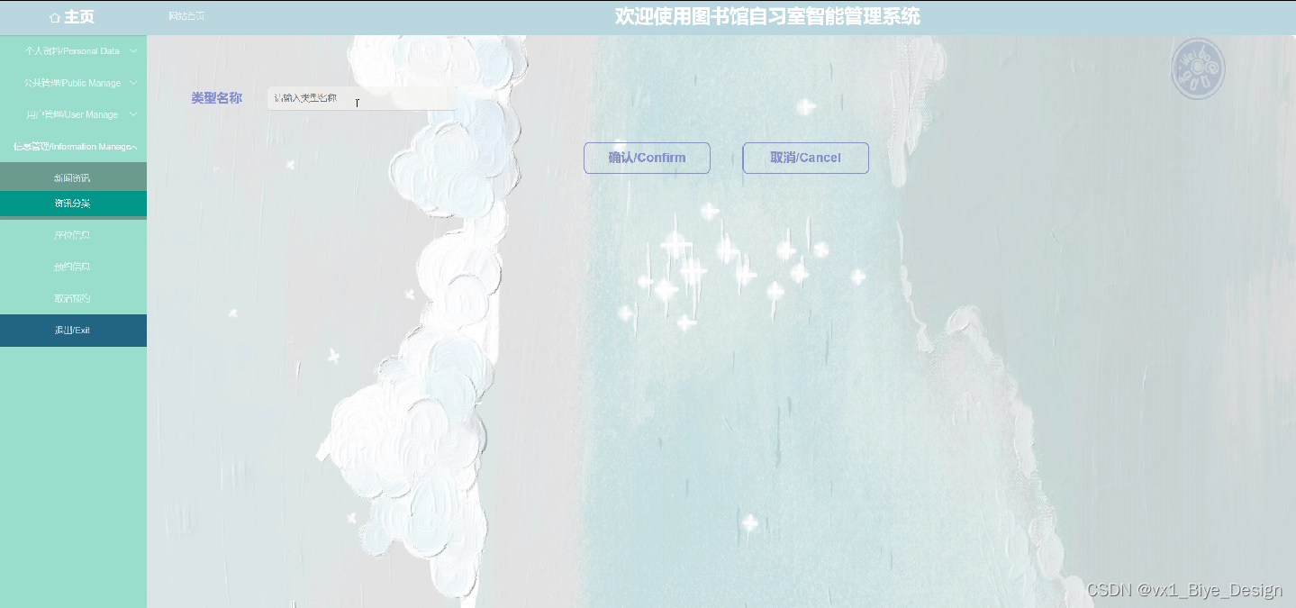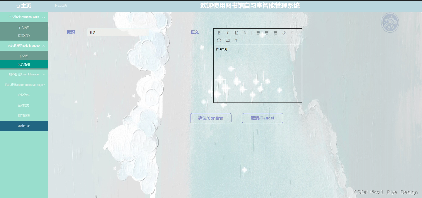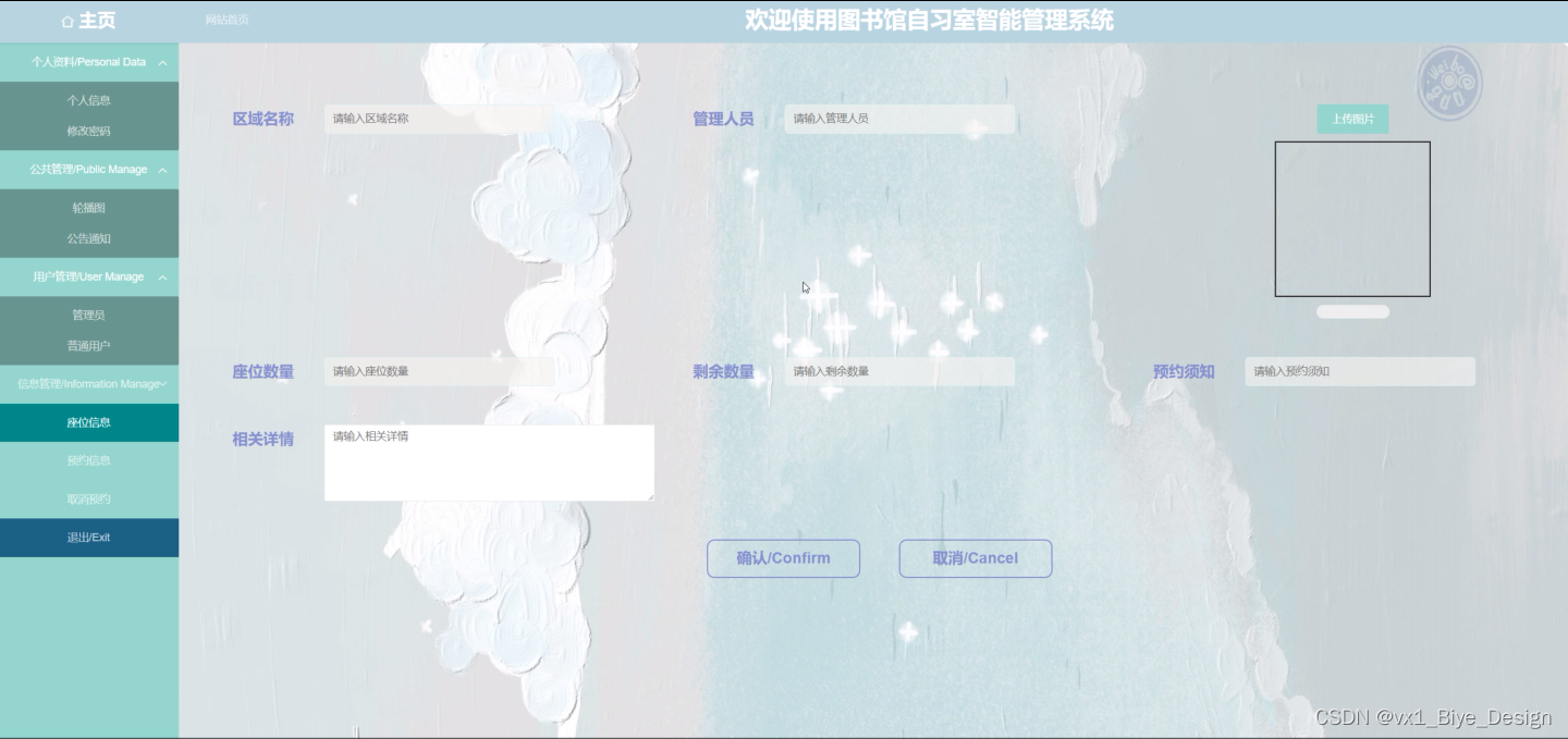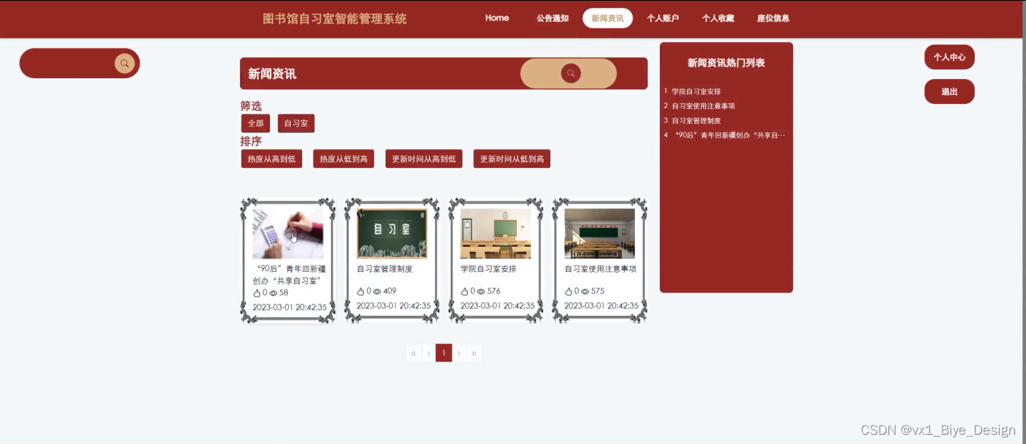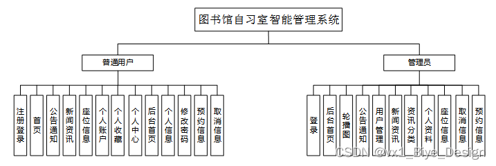 (1)功能要求:主页、个人资料、轮播图管理、公告通知管理、用户管理(管理员、普通用户)信息管理(新闻资讯、资讯分类)预约信息、取消信息、座位信息等功能模块。