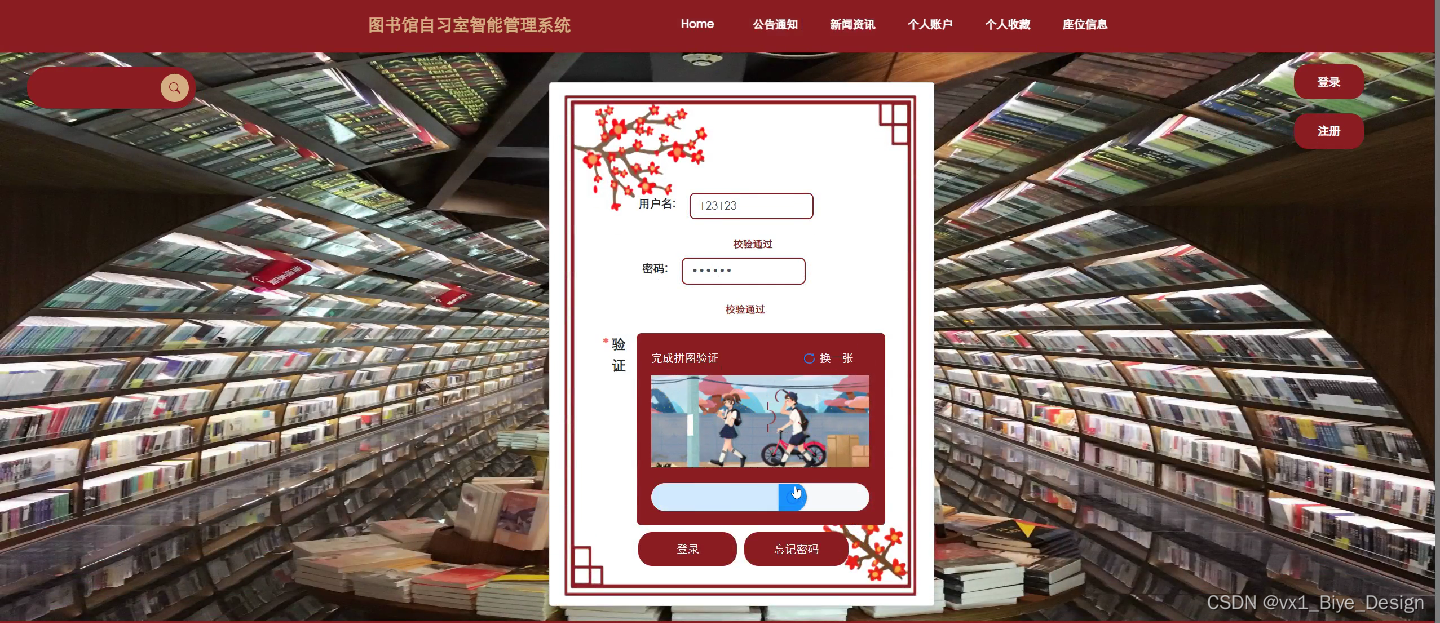 管理员登录图书馆自习室智能管理系统,在登录页面输入用户名、密码、图片验证等进行登录,如图5-1所示。