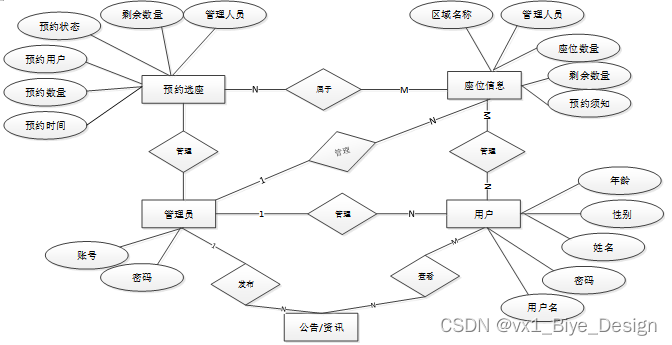 通过图书馆自习室智能管理系统的功能进行规划分成几个实体信息,实体信息将通过ER图进行说明,本系统的主要实体图如下: