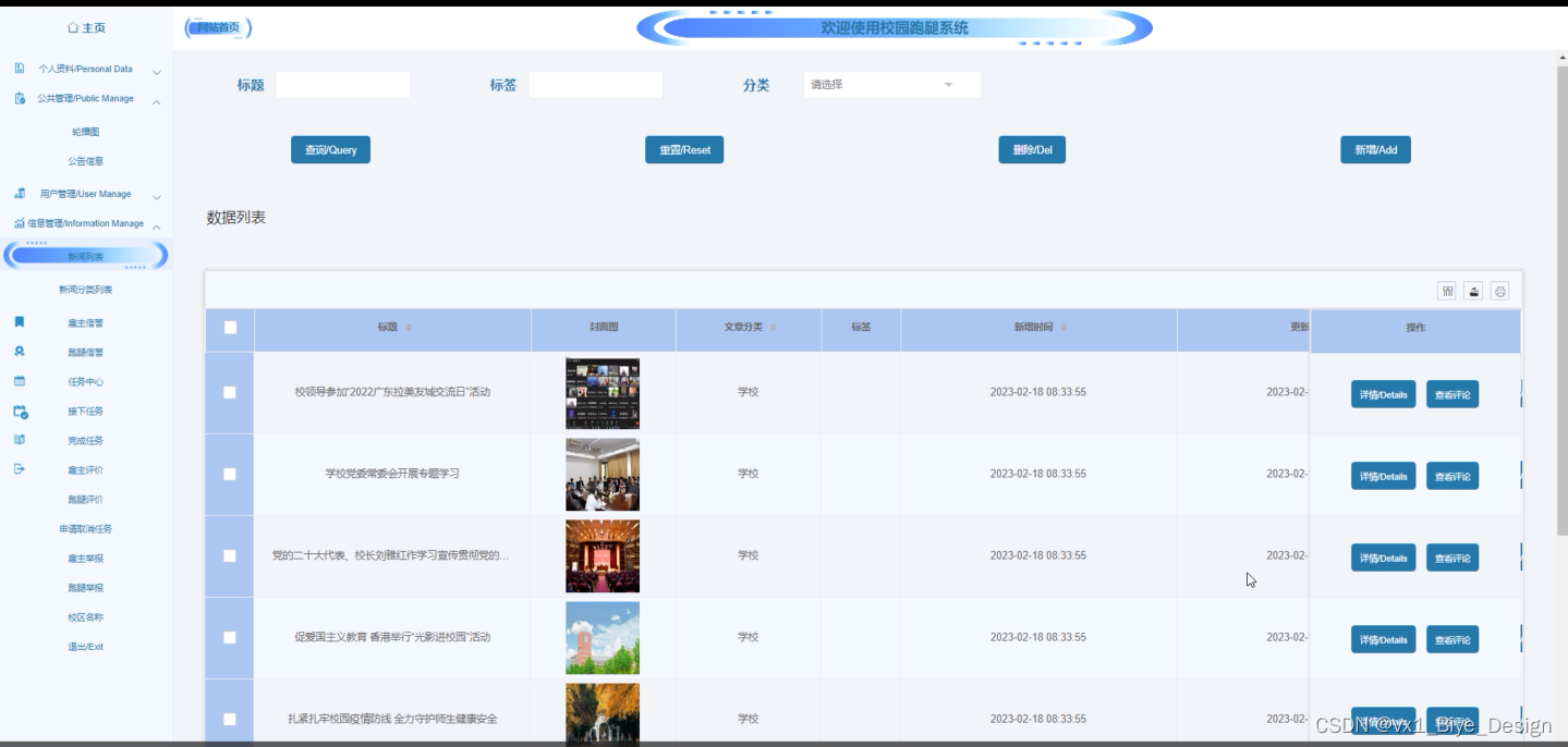This design mainly realizes the campus running system integrating the advantages of humanization, efficiency and convenience, and completes the home page, personal management, user management (administrator, employer, running errand), public management (broadcast map announcement information), information management (news list, news classification list), task center, next task, complete task, employer evaluation, running evaluation, application for cancellation of task, employer report, running report Campus name and other functional modules. The system communicates with the server through the browser to realize data interaction and change. The system improves work efficiency and reduces errors and omissions in data storage through scientific management and convenient services. The campus running system is a campus running system developed based on the SSM framework technology. The foreground of the system is displayed through JSP pages, and the background uses the SSM framework. The database uses the popular open source relational database MYSQL. This system uses the current popular vue. js technology in the foreground to make the page more neat and beautiful.