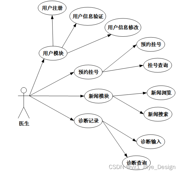 2.医生用户主要使用系统的医院预约挂号业务,下图所示为医生用户的用例图。