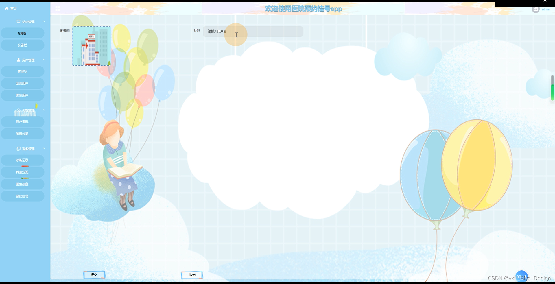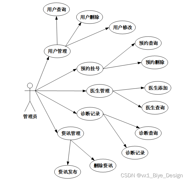 3.管理员主要负责首页、站点管理(轮播图、公告栏)用户管理(管理员、系统用户、医生用户)内容管理(医疗资讯、资讯分类)更多管理(诊断记录、科室分类、医生信息、预约挂号),下图所示描述管理员的用例图。