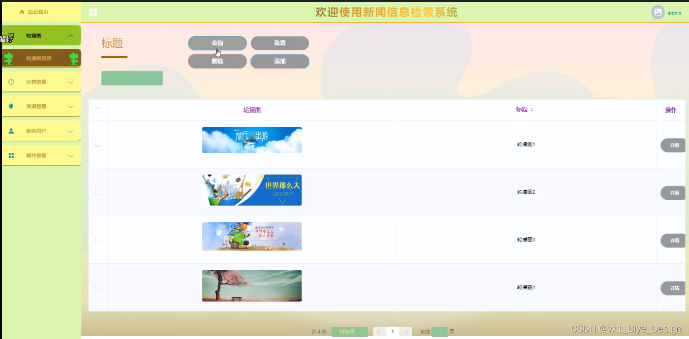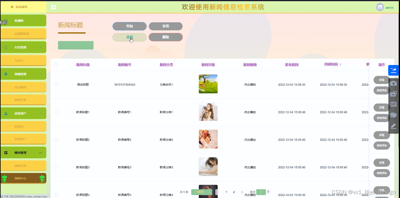 This design mainly realizes the news information retrieval system integrating the advantages of humanization, efficiency and convenience, and completes the functional modules such as home page, rotation chart, announcement management, resource management, system user, video classification, video center, etc. The system communicates with the server through the browser to realize data interaction and change. The system improves work efficiency and reduces errors and omissions in data storage through scientific management and convenient services. The news information retrieval system is developed using the springboot technology based on the MVVM model and compiled using the Eclipse 2017 CI 10 compiler. In terms of data, it mainly uses Microsoft's MySQL relational database as the data storage medium, and cooperates with the foreground HTML+CSS technology to complete the system development.