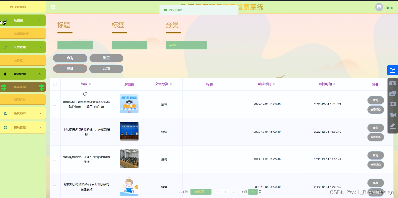 本设计主要实现集人性化、高效率、便捷等优点于一身的新闻信息检索系统,完成首页、轮播图、公告管理、资源管理、系统用户、视频分类、视频中心等功能模块。系统通过浏览器与服务器进行通信,实现数据的交互与变更。本系统通过科学的管理方式、便捷的服务提高了工作效率,减少了数据存储上的错误和遗漏。新闻信息检索系统采用基于 MVVM模式的springboot技术进行开发,使用 Eclipse 2017 CI 10 编译器编写,数据方面主要采用的是微软的MySQL关系型数据库来作为数据存储媒介,配合前台HTML+CSS 技术完成系统的开发。