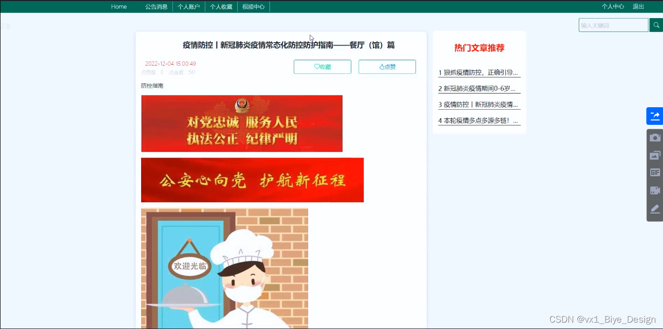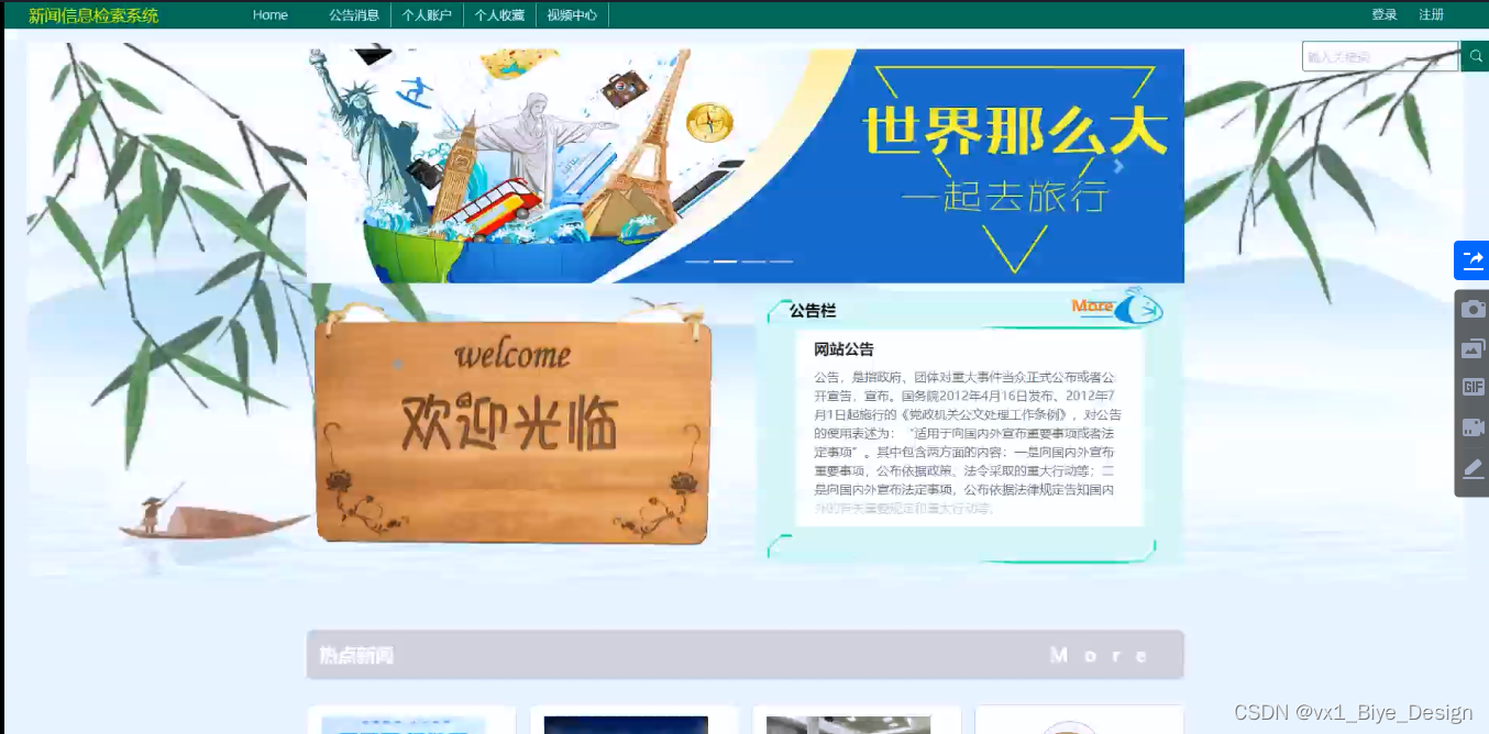 (1)首页信息:当用户进入本新闻信息检索系统的前台的时候,首先展示在眼前的是导航栏、公告消息、个人账户、个人收藏、视频中心、个人中心等信息,用户可以根据自己个人的需求进行查看;