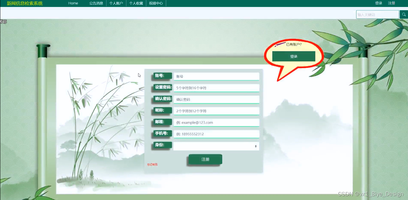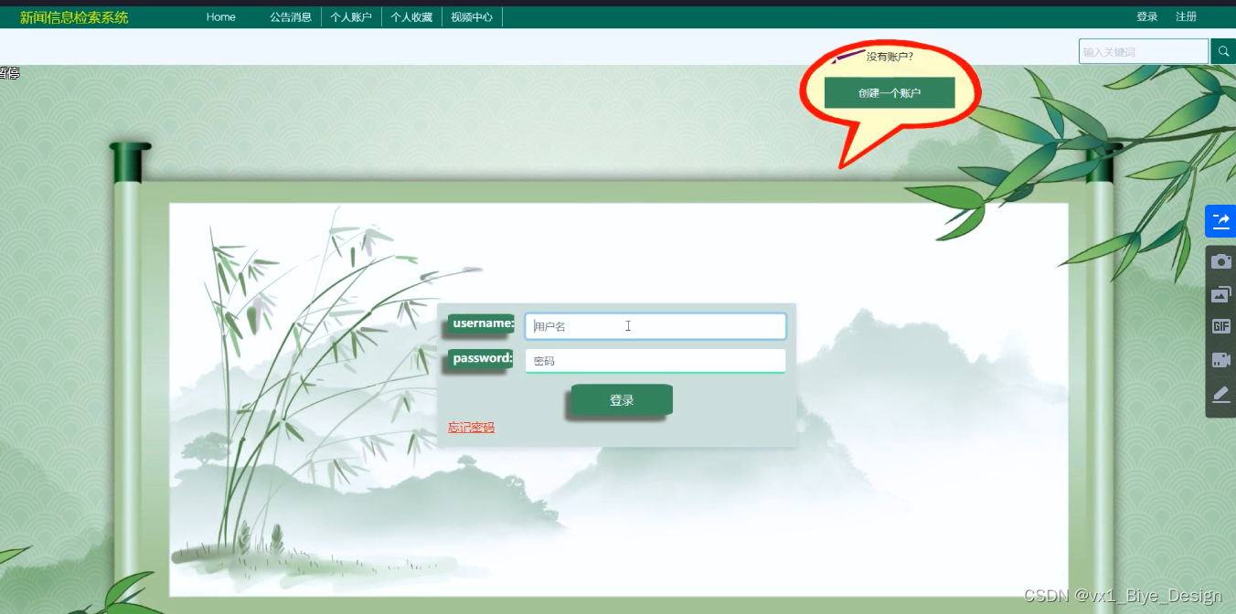(2)注册登录:在系统的右上角有登录+注册按钮,如果用户想要登录到系统当中,可以点击“登录”按钮,然后填写号用户名+密码,点击“登录”按钮,系统会对你的用户名密码进行核对,正确的话就会登录成功了,如果没有账号的话,可以点击右上角的“注册”按钮,然后根据提示输入好用户信息,就可以得到账号和密码了;