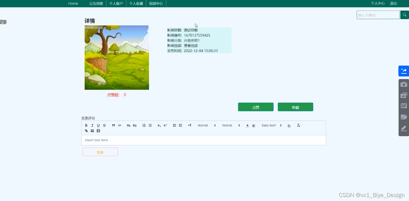 (5)个人收藏:在首页导航栏上我们会看到“个人收藏”这一菜单,我们点击进入进去以后,可以对是热点新闻信息进行收藏、评论;