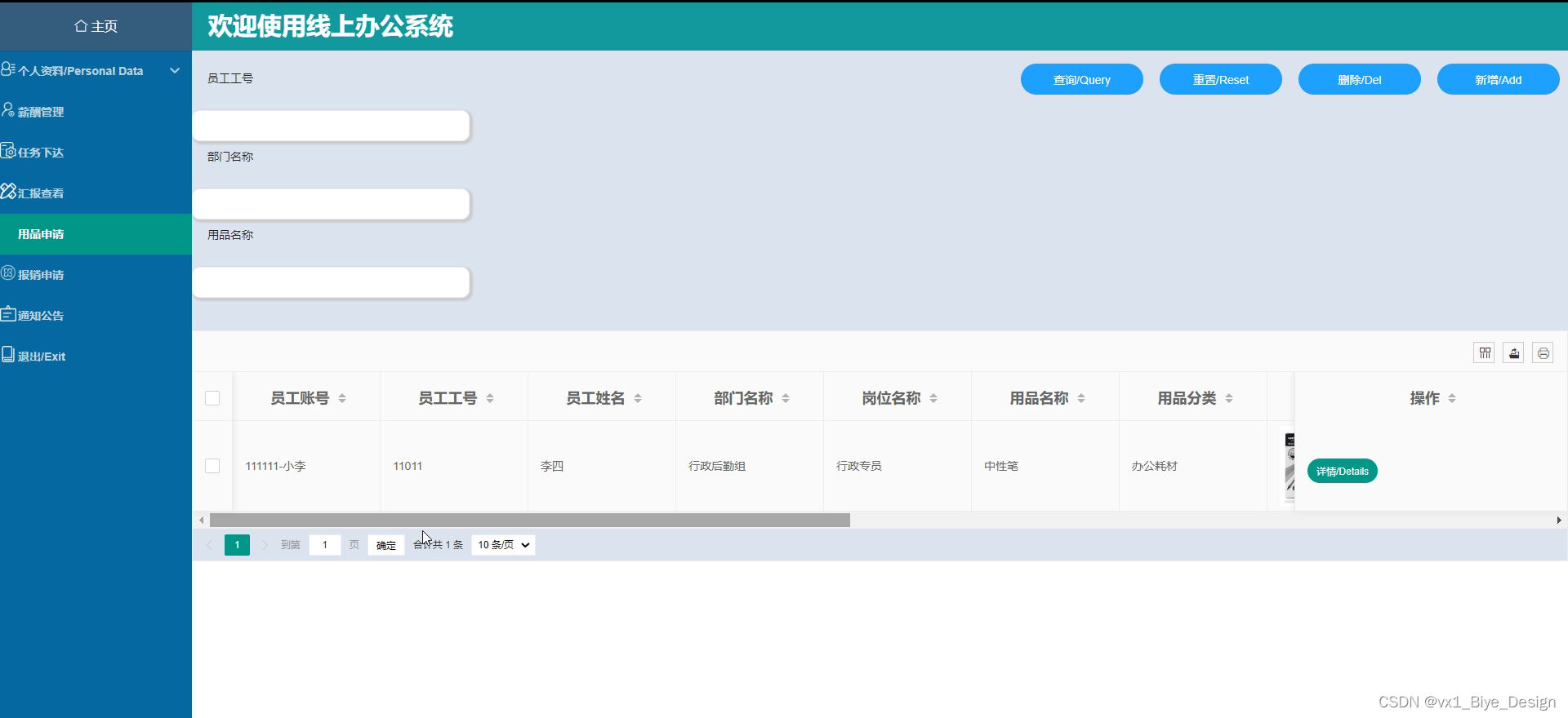 用品申请功能整体流程:员工填写好用品申请信息之后,点击提交按钮,用品申请信息录入成功之后等待管理员审核