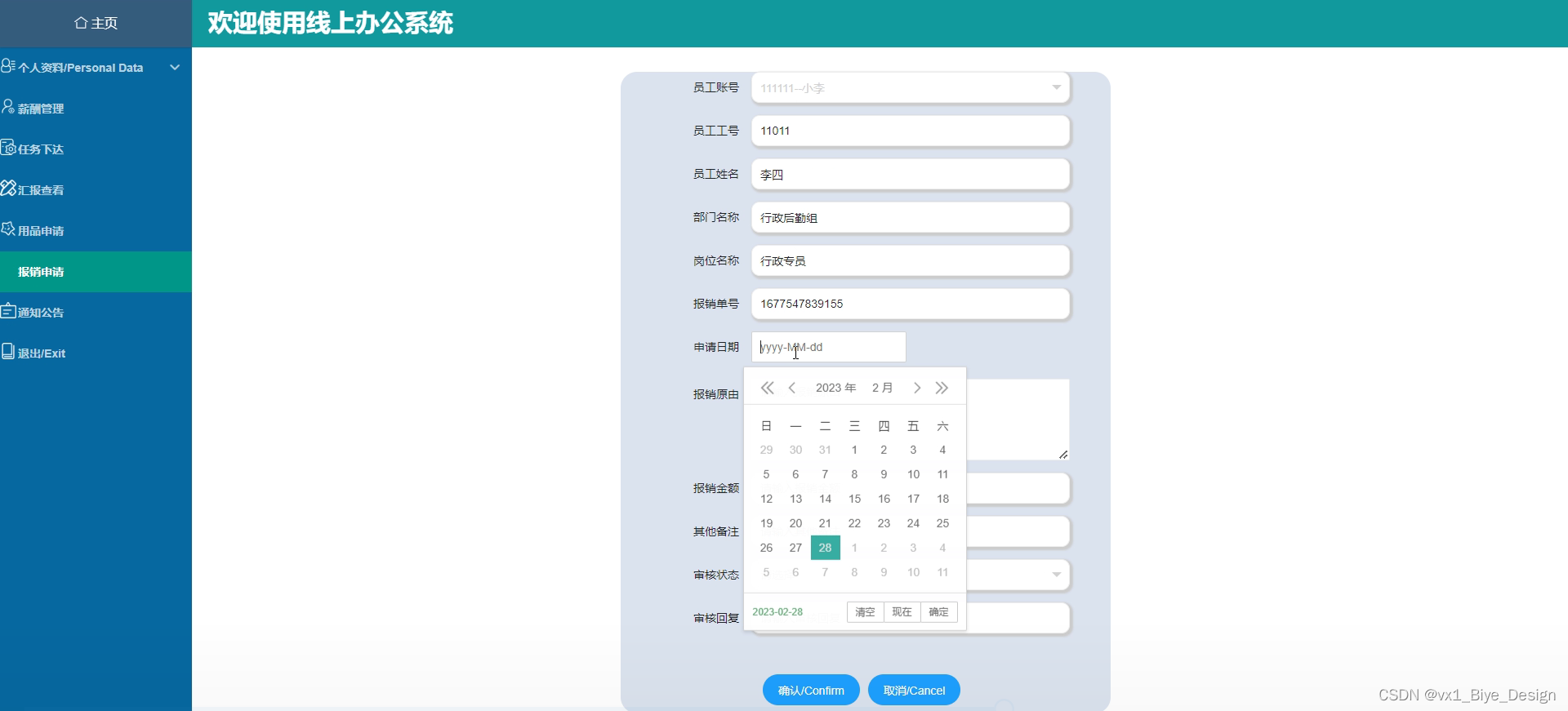 添加报销申请时,会给出数据填写页面,该页面根据的报销信息同样会事先发送Ajax请求查询编号是否已存在,数据存储好之后提交到后台,会调用相关服务在数据库中插入记录。
