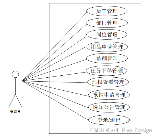 线上办公系统的设计基于现有的网络,可以实现管理员:员工管理、部门管理、岗位管理、薪酬管理、任务下达、汇报查看、用品申请、报销申请管理等详细的了解及统计分析。根据系统功能需求建立的模块关系图如下图: