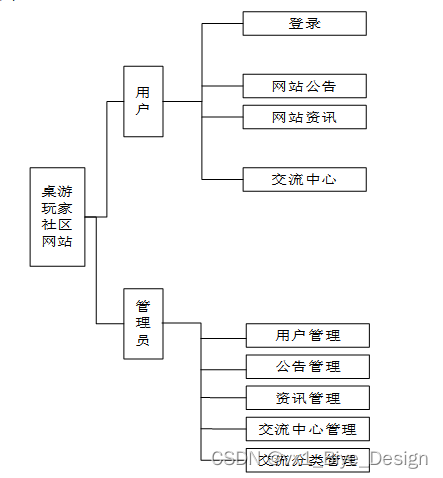 桌游玩家社区网站中,用户可以在线进行交流中心互动等,其模块功能结构,具体的结构图如下: