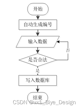 用户成功登入系统后就能够实现增加数据的操作,增加数据的编号是特定的,系统生成,用户不能随意填写,除了编号以外,其他增加信息用户自己填写,填写后的信息经过系统验证,验证合法通过就显示增加数据成功了,相反的话,就没有增加成功,图2-1显示的就是在增加数据时的流程。
