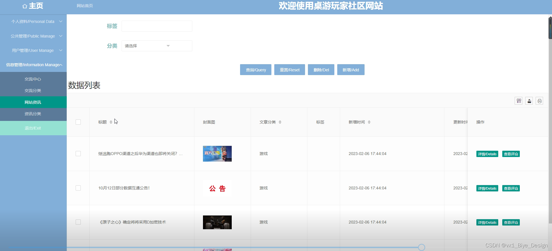 桌游玩家社区网站中的管理人员在“网站资讯管理”这一菜单下是可以对网站资讯信息进行添加发布,其管理界面如下图4-9所示。