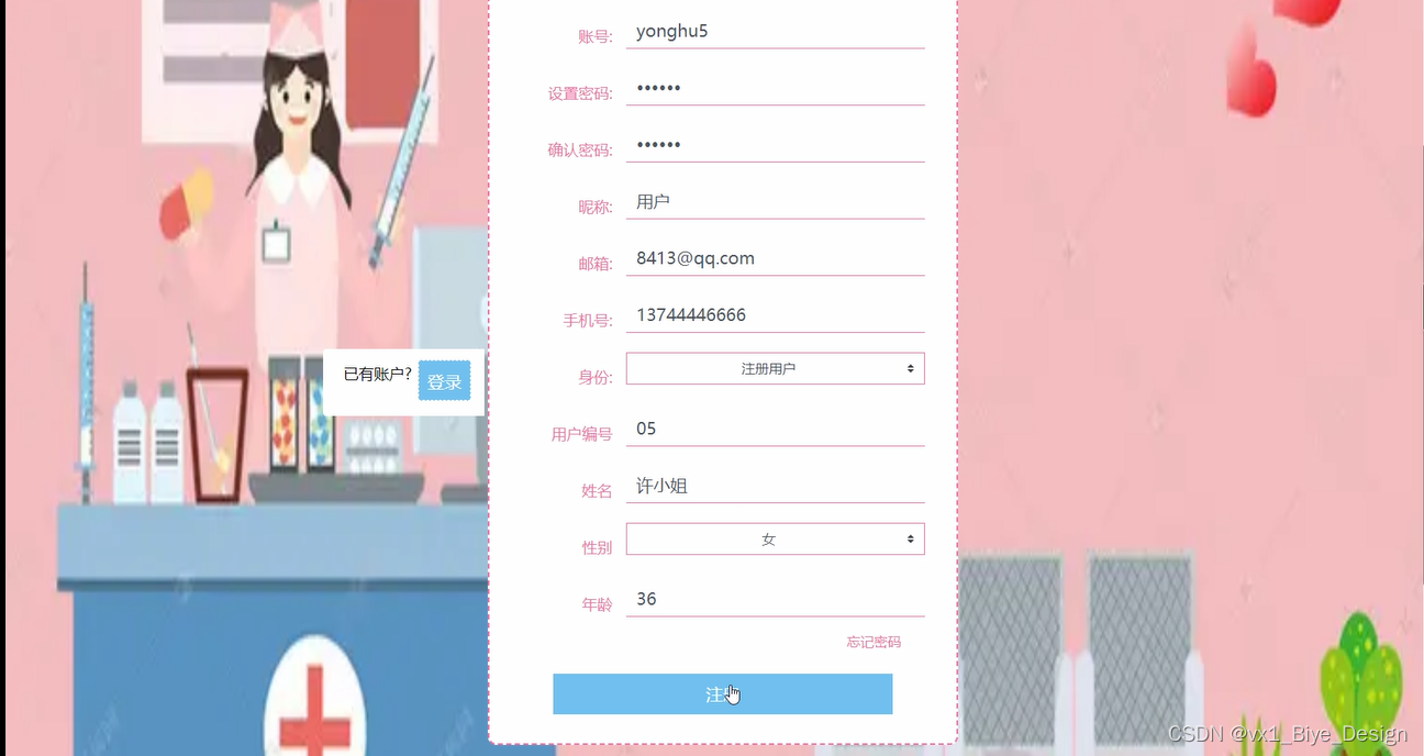 医生:用于记录用户的各种信息,包括病房、用户资料、姓名、联系方式、联系地址、科室、是否审核等数据项。