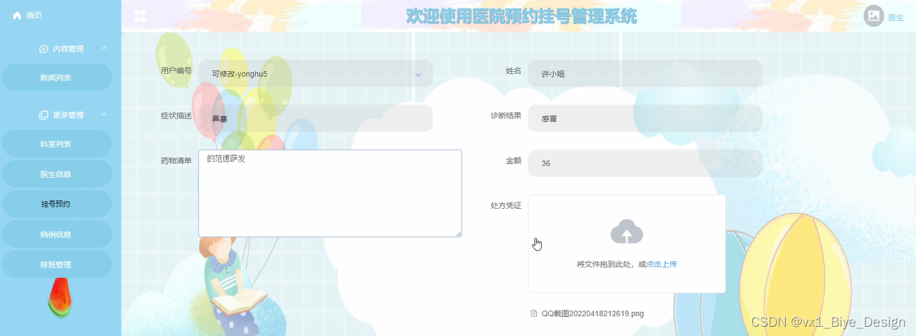 预约挂号管理:对预约挂号单进行查询、录入诊断结果、开药、录入金额、上传处方等操作。
