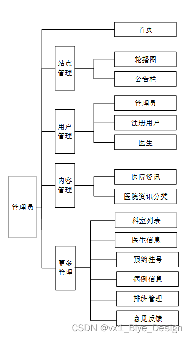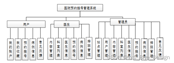 医院预约挂号管理系统总体分为前台用户模块、医生模块和后台管理员模块。