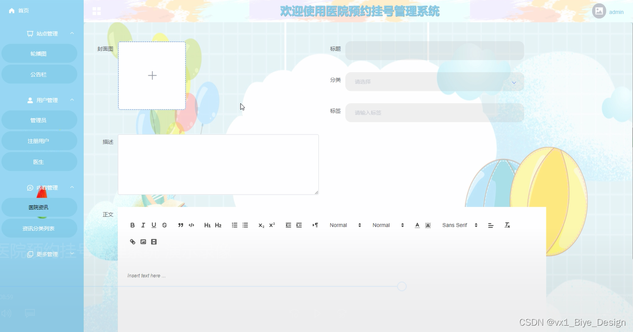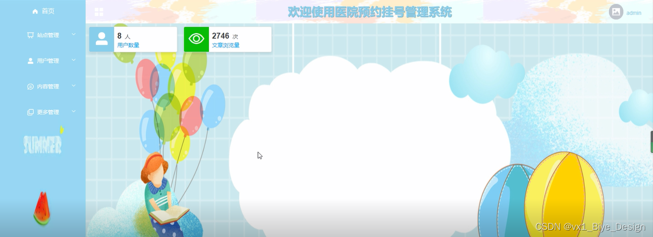 管理员进入到界面,通过界面的任务大厅,登录成功后进入到系统可以进行查看首页、站点管理(轮播图、公告栏)、用户管理(管理员、注册用户、医生)、内容管理(医院资讯、医院资讯分类)、更多管理(科室列表、医生信息、预约挂号、病例信息、排班管理、意见反馈)等功能模块,进行相对应操作,如图5-13所示