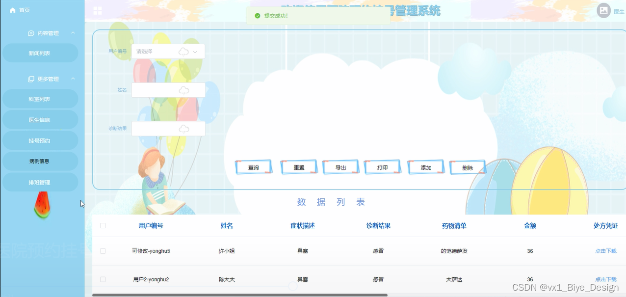 病例信息管理:对病例信息进行查询、重置、导出、打印、添加、删除等操作。
