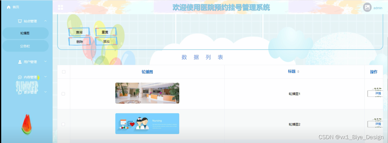 站点管理:对轮播图和公告消息进行查询、重置、添加、删除等操作。