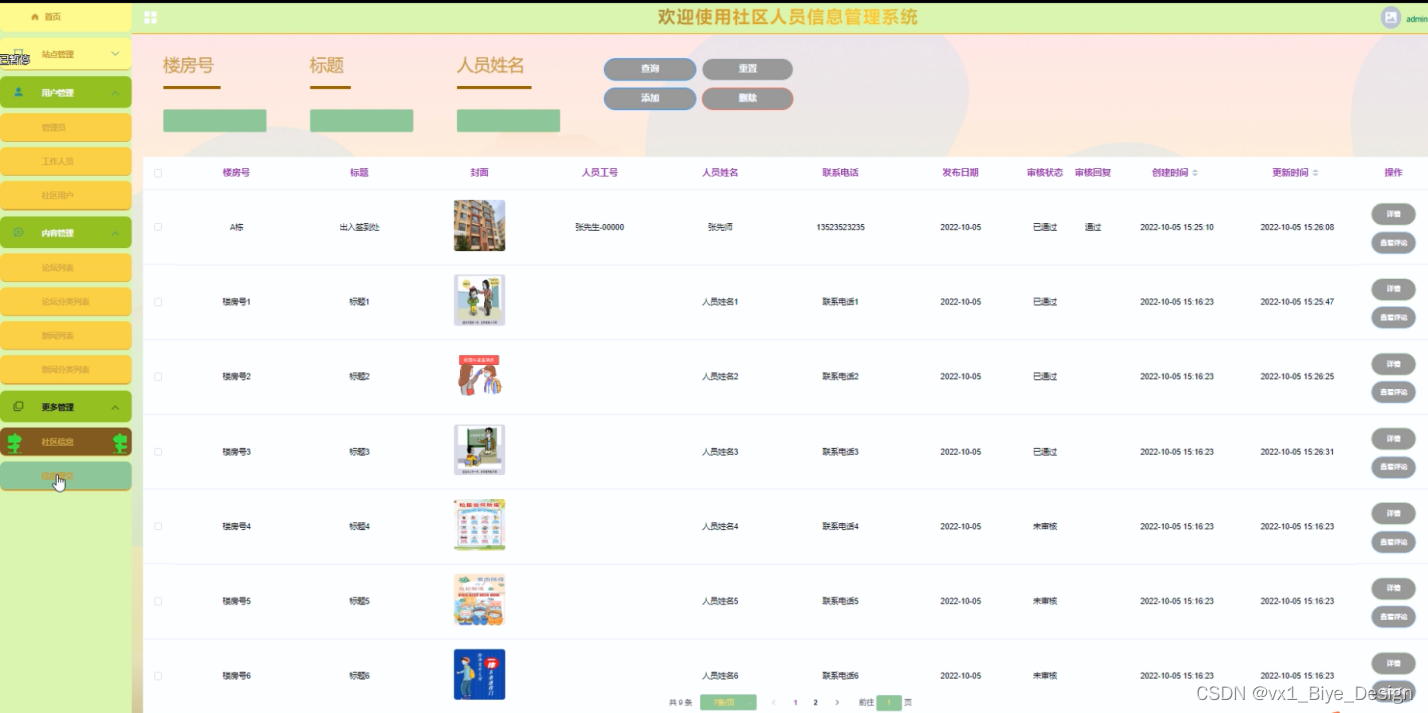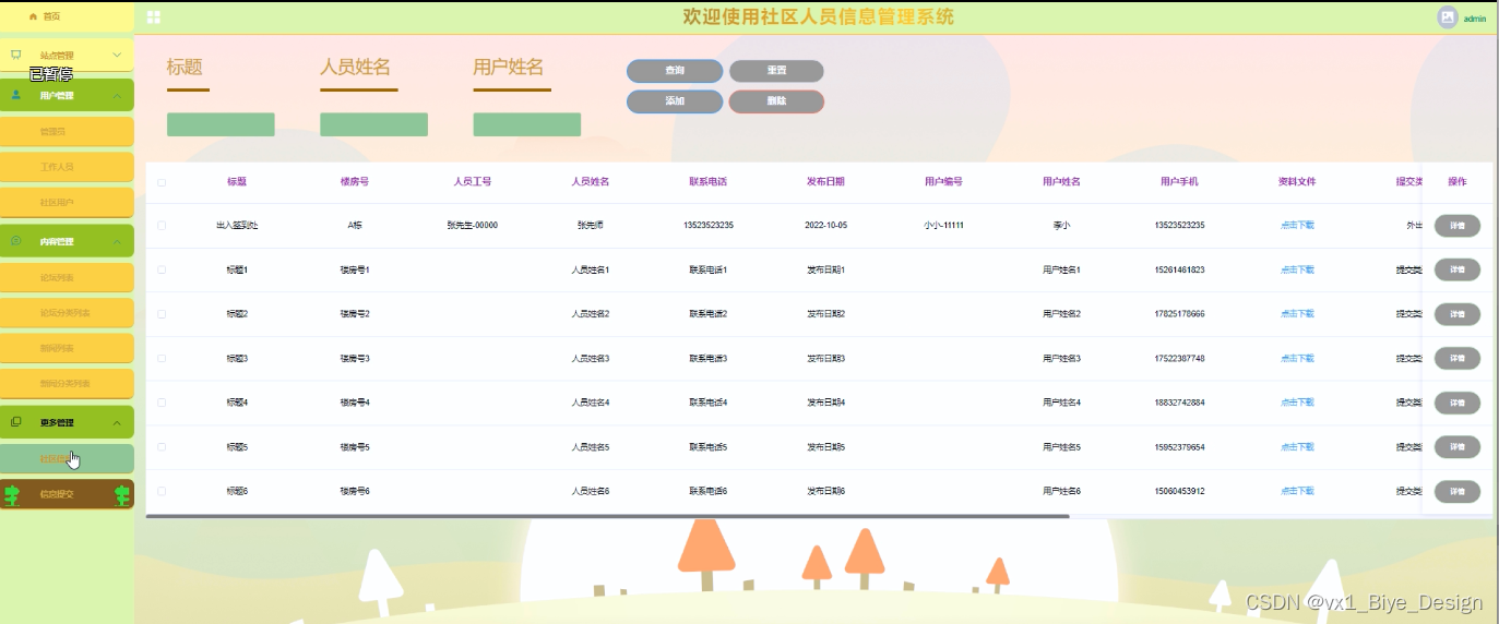 With the gradual maturity of computer science and technology, people have deeply realized that computers play a powerful role in various fields. Computers have entered various fields of human social development and played a very important role. At present, the community personnel information management system is a systematic and complex work, which requires a team to cooperate with each other and work together. In this field, the traditional manual access or management of information involved in the community personnel information management system with some software often cannot track and manage all kinds of information in the community personnel information management system in real time. In order to further improve the unified management of the software community personnel information management system process and resources, more comprehensively and effectively serve the software development process, and better facilitate the management of the software development process, Therefore, this community personnel information management system is developed.
