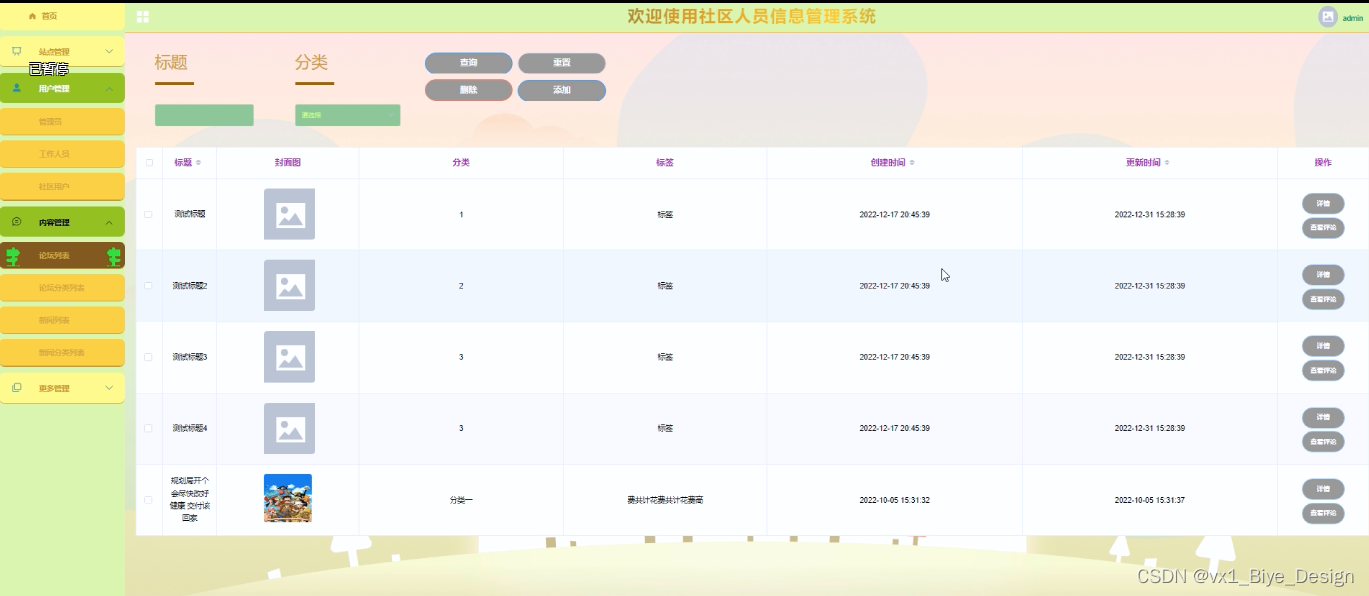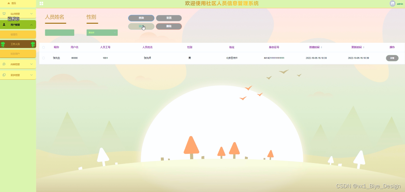 (3)用户管理:当点击“用户管理”这一菜单的时候,会出现管理员+社区用户+工作人员三个子菜单,管理员可以对这三个模块进行增删改查操作;