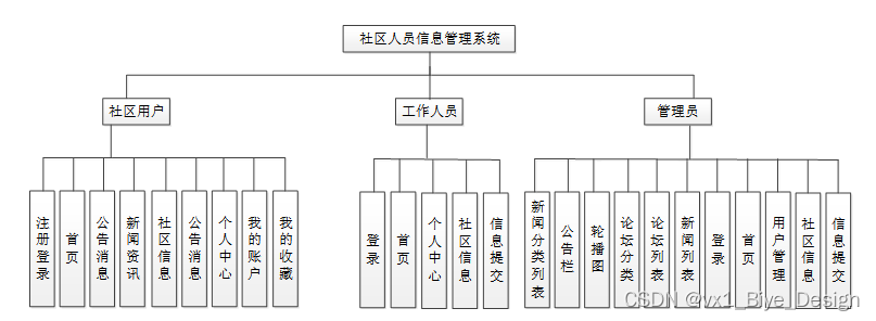 按照社区人员信息管理系统的角色,我划分为了社区用户管理模块、工作人员管理模块和管理员管理模块这三大部分。