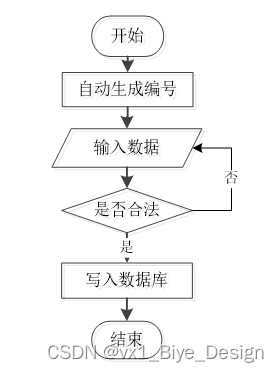用户成功登入系统后就能够实现增加数据的操作,增加数据的编号是特定的,系统生成,用户不能随意填写,除了编号以外,其他增加信息用户自己填写,填写后的信息经过系统验证,验证合法通过就显示增加数据成功了,相反的话,就没有增加成功,图2-1显示的就是在增加数据时的流程。