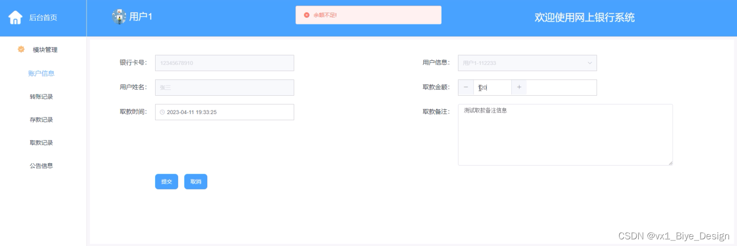 取款记录:在取款记录页面中可查看银行卡号、用户信息、用户姓名、取款金额、取款时间等信息,当取款金额不足时,系统会显示“余额不足”, 如图5-12所示
