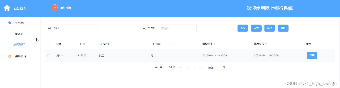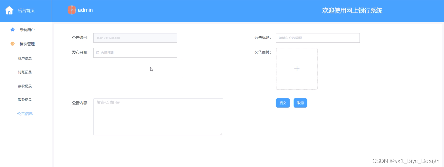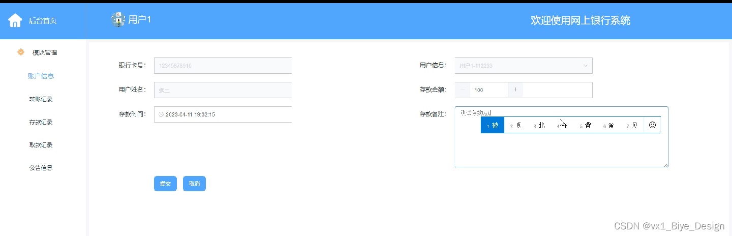 Any system must follow the basic process of system design, and this system is no exception. It also requires market research, analysis of paper requirements, summary design, detailed system design, testing and coding, and other steps to design and implement an online banking system. The system adopts B/S mode, applies Java technology, and MySQL is the backend database. The system mainly includes functional modules such as the backend homepage, personal center, system users, account information, transfer records, deposit records, withdrawal records, and announcement messages.