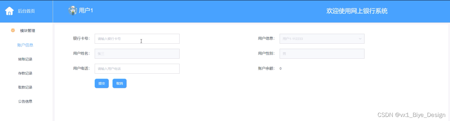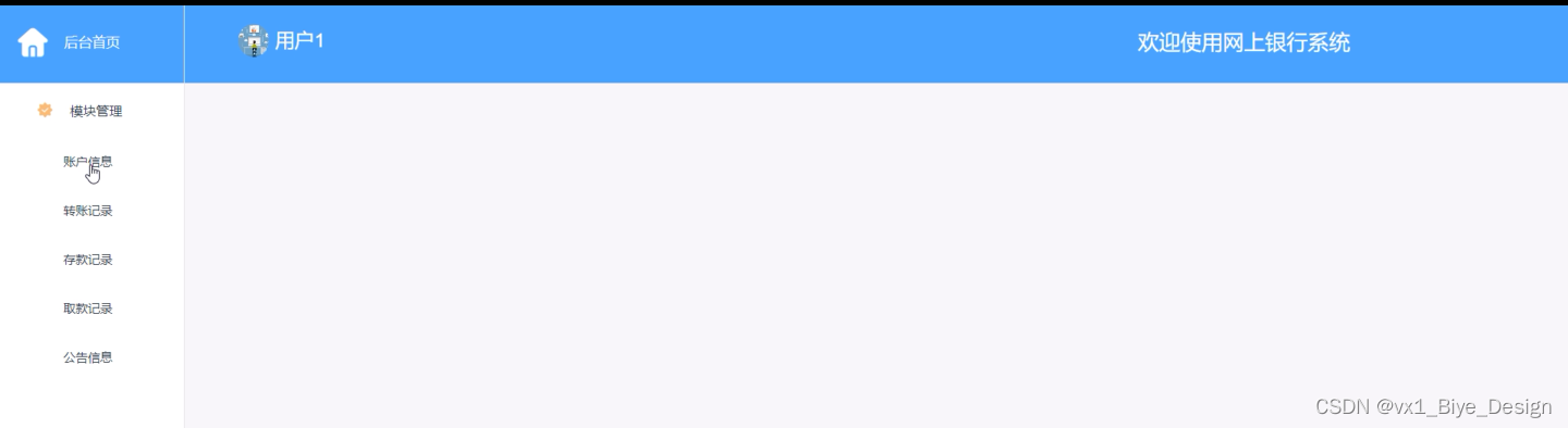 系统中的核心用户是系统管理员,管理员登录后,通过管理员菜单来管理后台系统。主要功能有:后台首页,个人信息,系统用户(管理员、系统用户)模块管理(公告信息、账户信息、转账记录、存款记录、取款记录)等功能模块。