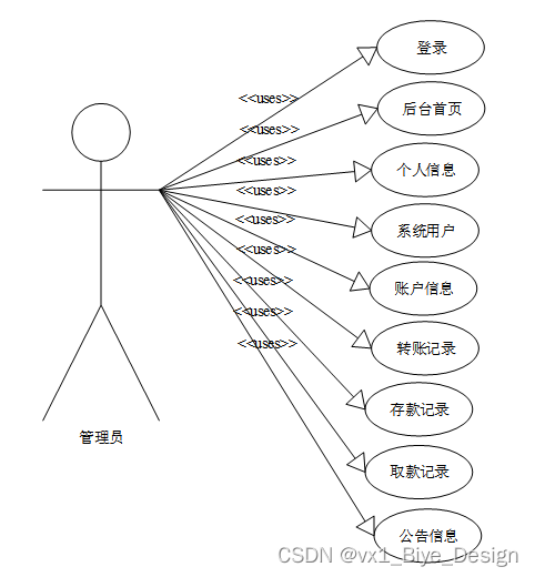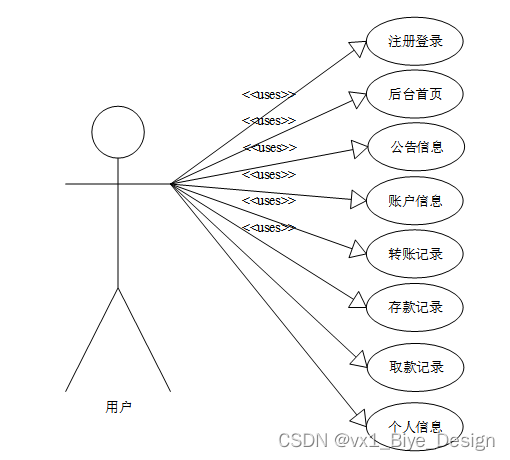 用户进入系统可以进行后台首页、个人信息模块管理(公告信息、账户信息、转账记录、存款记录、取款记录)等功能。用户用例如图3-8所示。