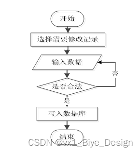管理员可以对信息等进行的修改,用户也可以对自己权限内的信息进行修改,首先进入修改信息界面,输入修改信息数据,系统进行数据的判断验证,修改信息合法则修改成功,信息更新至数据库,信息不合法则修改失败,重新输入。修改信息流程图如图3-5所示。
