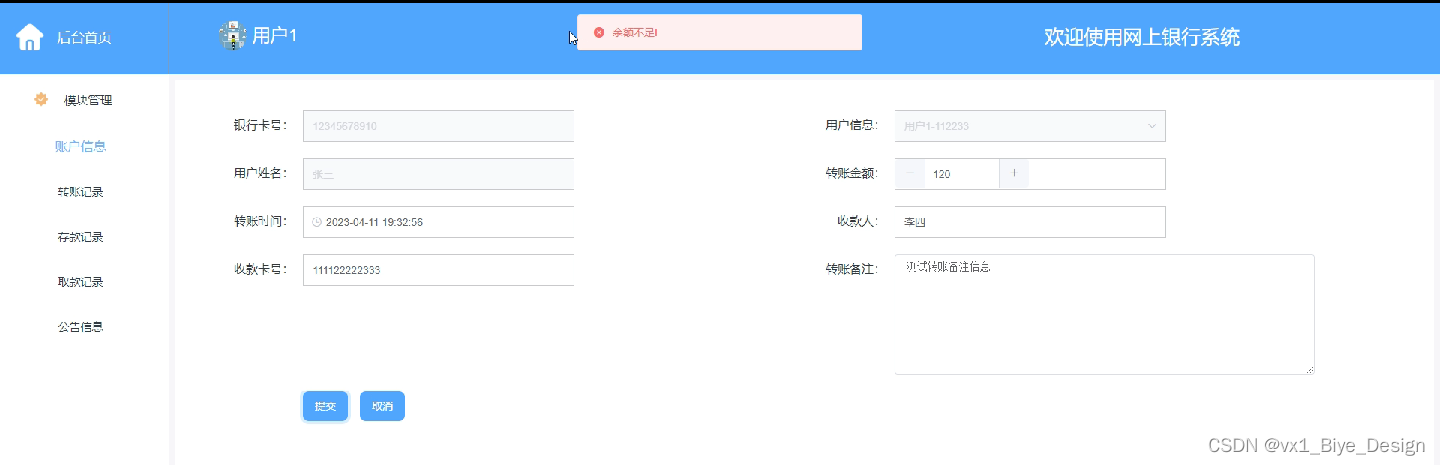 转账记录,在转账记录页面中可查看银行卡号、用户信息、用户姓名、转账金额、转账时间、收款人、收款卡号等信息,当转账金额不足时,系统会显示“余额不足”,如图5-11所示: