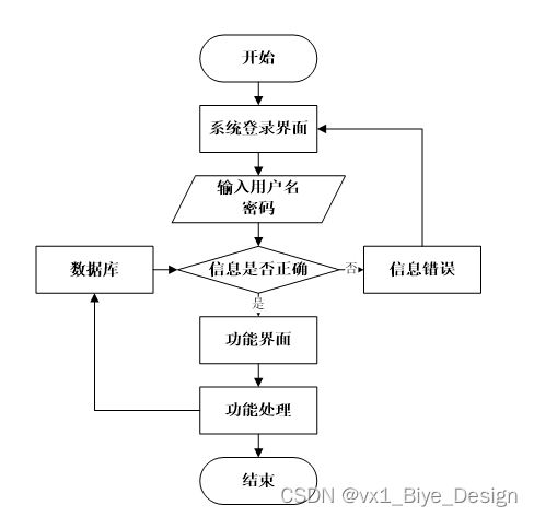 用户打开并进入系统后,会先显示登录界面,输入正确的用户名和密码,系统自动检测信息,若信息无误,则用户会进入系统功能界面,进行操作,否则会提示错误无法登录,操作流程如图3-3所示。