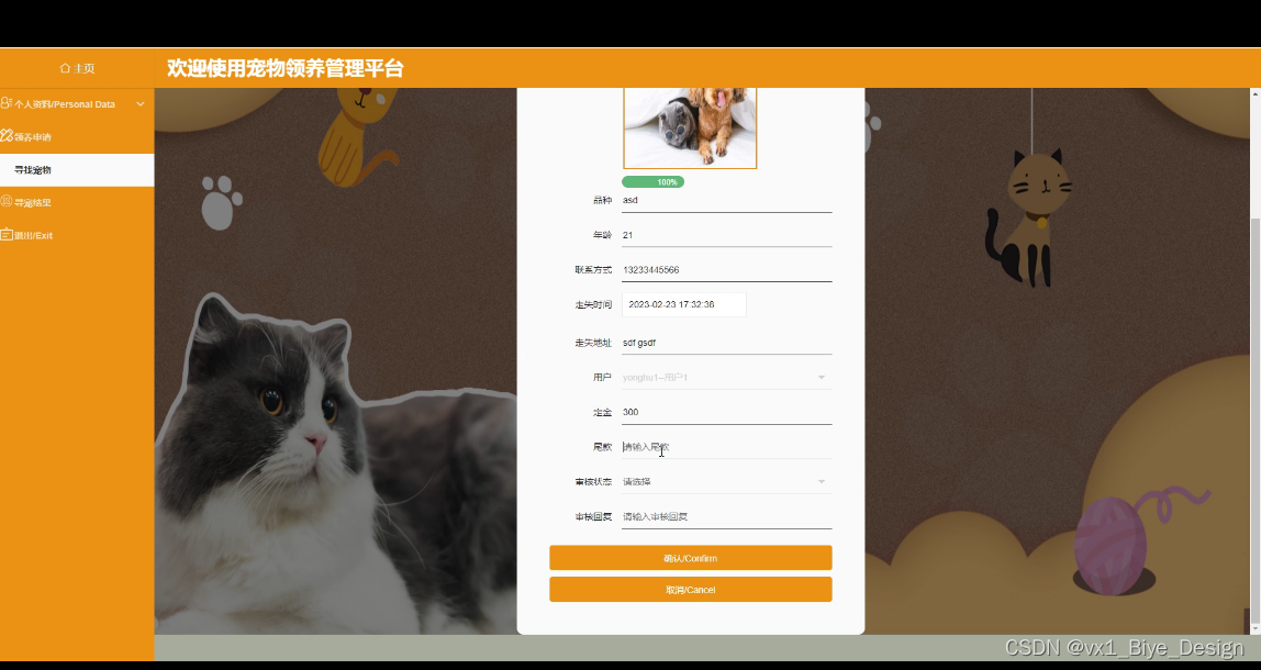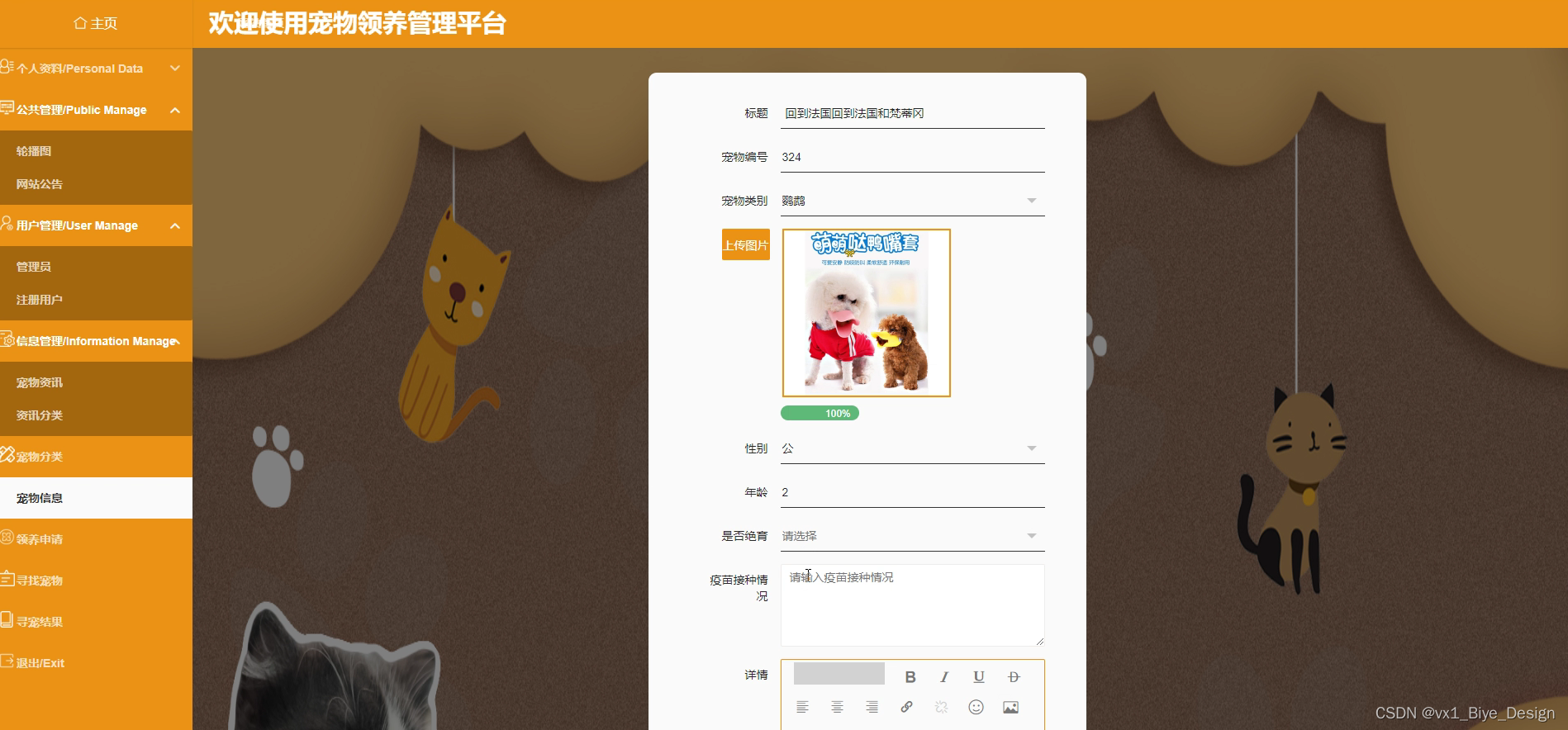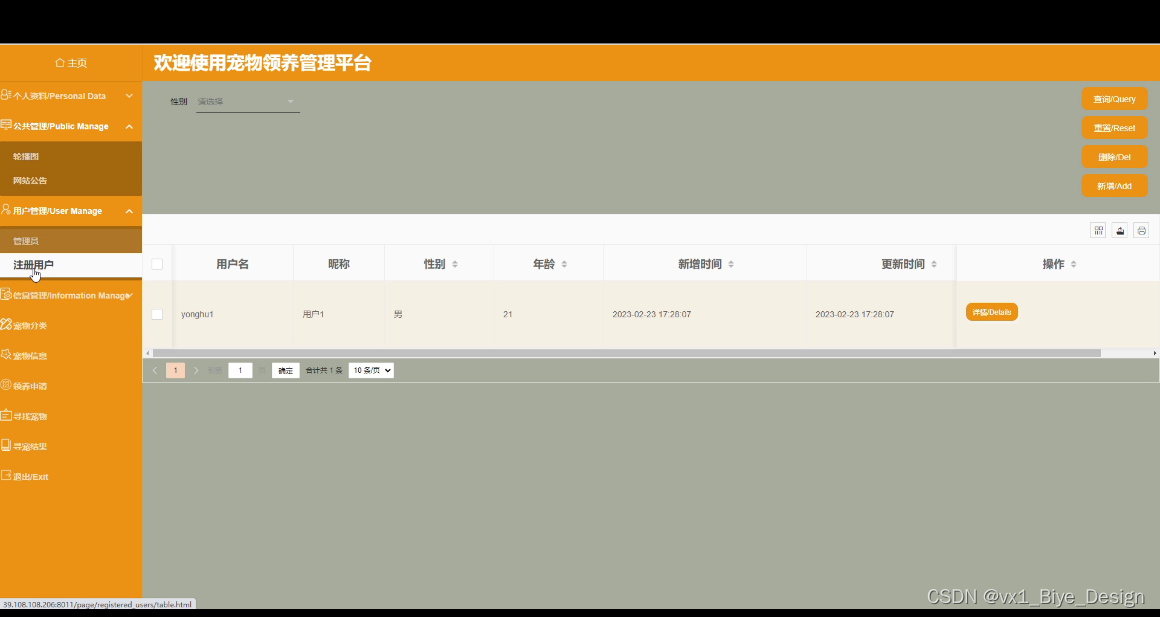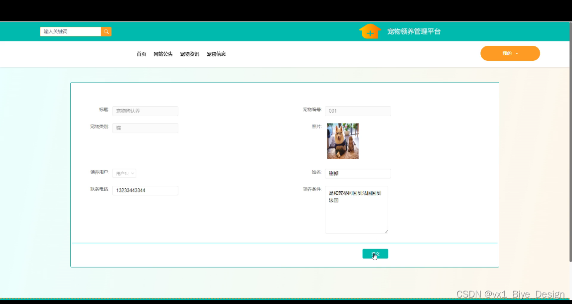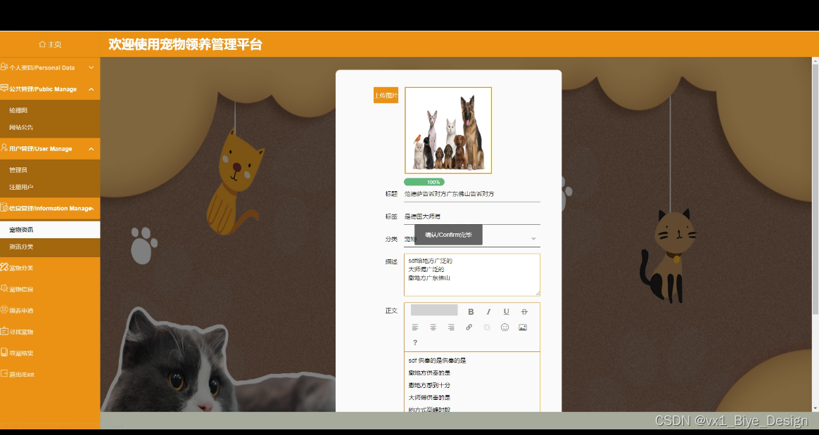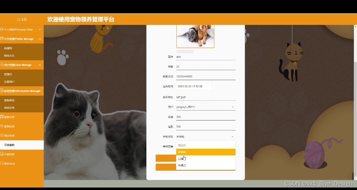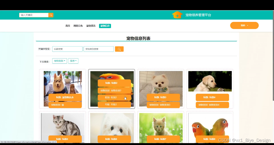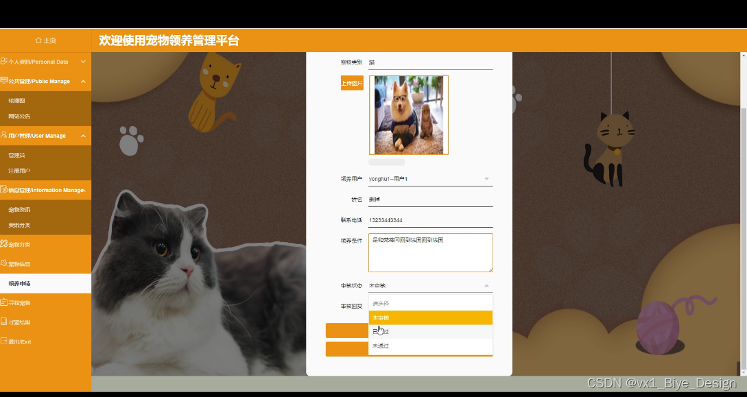 目前许多人仍将传统的单机设备作为信息管理的主要工具,而网络技术的应用只是起到辅助作用。在对网络工具的认知程度上,较为传统的office软件等仍是人们使用的主要工具,而面向各个专门行业的管理系统的信息管理软件仍然缺乏群众基础。本选题则旨在通过标签分类管理等方式,实现系统首页,个人资料,公共管理(轮播图,网站公告),用户管理(管理员,注册用户),信息管理(宠物资讯,资讯分类),宠物分类,宠物信息,领养申请,寻找宠物,寻宠结果等功能。