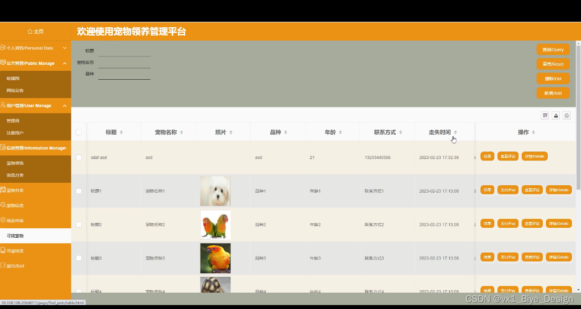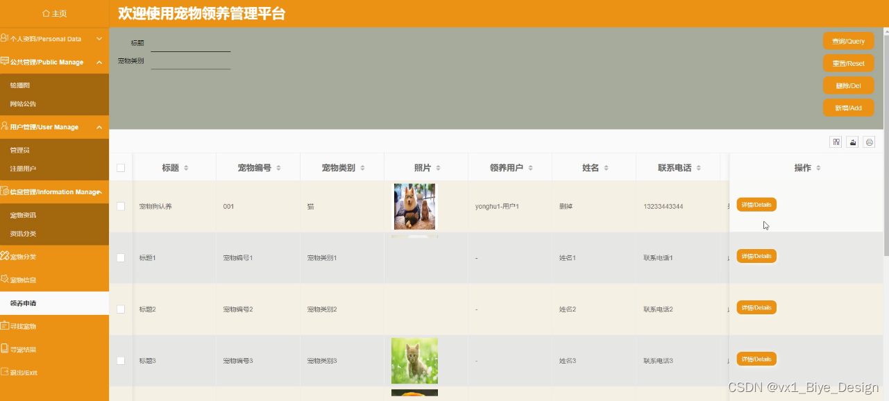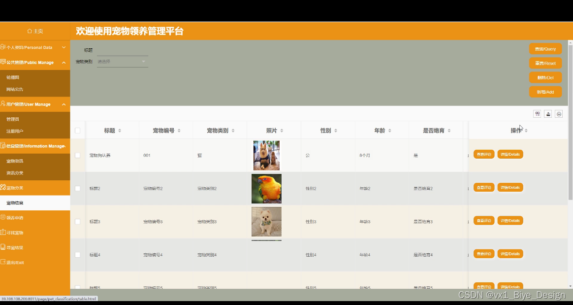 宠物信息:可以查看标题,宠物编号,类别,照片等信息,可以进行查询、重置、删除、添加等操作,如下图所示。