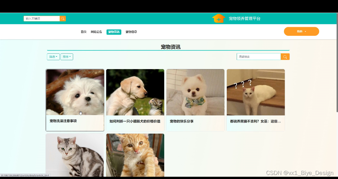 随着如今社会的快速发展,老龄化现象越来越严重,单身群体数量与日俱增,在物质条件满足的状态下,追求另一种心灵陪伴需求越来越多,很多单身青年和家庭都会选择以喂养宠物的方式来进行情感弥补,对于宠物来源,相当一部分爱心人士坚持以领养代替购买,但目前并没有一个靠谱的领养平台,且由于涉及到的宠物的品种繁多,每种都有独特之处,普通的养宠方法并不能完全覆盖日常容易遇到的问题。因此,我想建立一个宠物领养管理平台。把爱宠人士形成的用户聚集起来,让大家的可以用爱心使宠物终结流浪,并且使养宠心得,经验得到充分的发挥,形成养宠用户的互助群体。