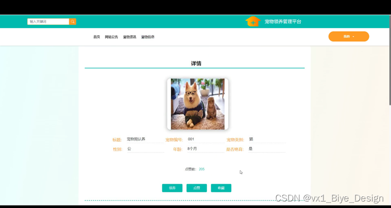宠物信息:可以查看可领养的宠物信息,可以选择领养,点赞,收藏等操作,如下图所示。