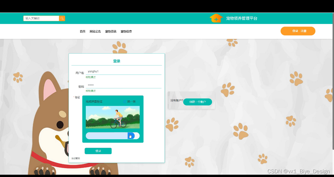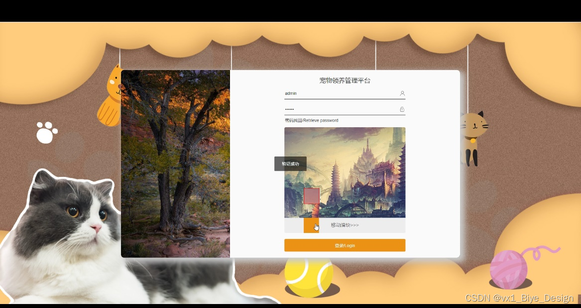 管理员登录宠物领养管理平台,在登录页面输入用户名、密码、图片验证等进行登录,如下图所示。