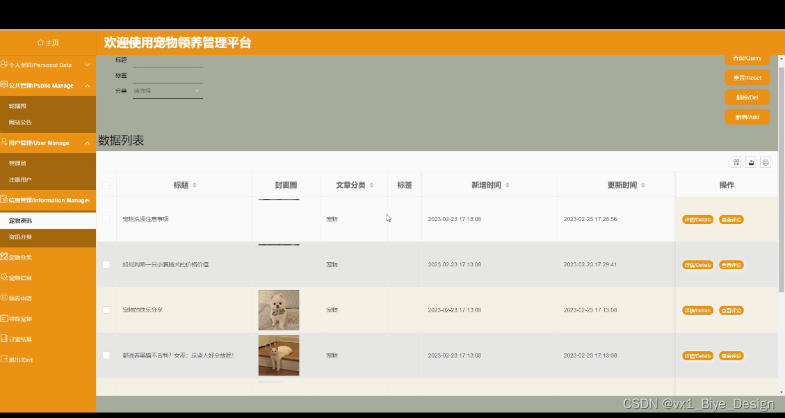 宠物资讯:可以查看资讯的标题,封面图,分类,新增时间等信息。可以进行查询、重置、删除、添加等操作,如下图所示。