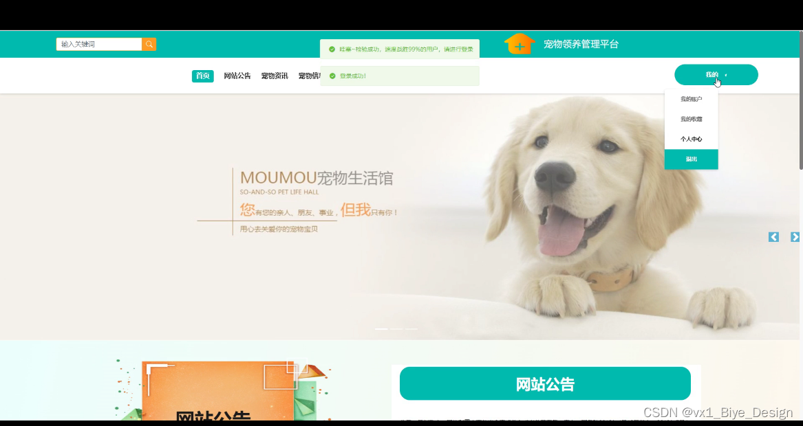 进入系统可以查看:首页,网站公告,宠物资讯,宠物信息,我的账户,我的收藏,个人中心,领养申请,寻找宠物,寻宠结果等功能模块,还可进行相应的操作,如下图所示。