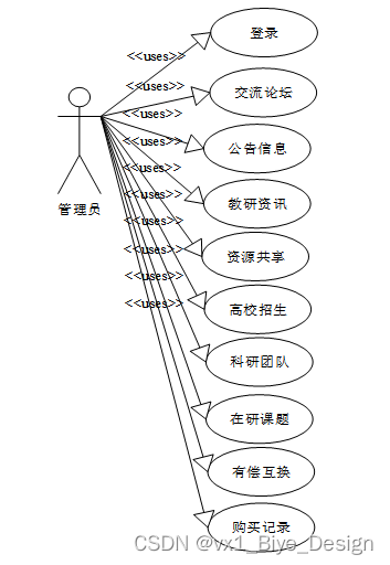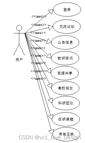 系统设计的目的是分析系统包括的所有功能结构,为开发人员设计开发和实现系统做好准备工作。经过前期的需求调查、分析和整理之后,确定的总体需求主要包括多个模块,分别是:首页、轮播图、公告信息、资源管理(考研资讯、资讯分类)交流管理(交流论坛、论坛分类)系统用户(管理员、系统用户)模块管理(资源共享、高校招生、科研团队、在研课题、有偿互换、购买记录)。系统整体角色分为两个部分,一是用户、二是管理员。权限分布也是很明显,管理员是最高权限拥有者。