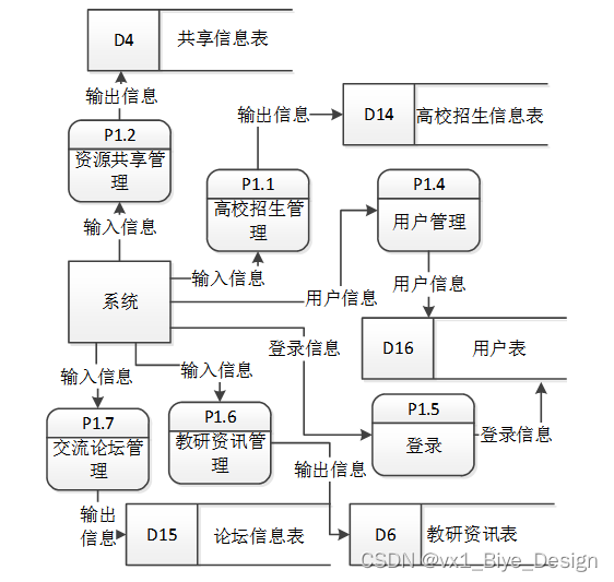 二层数据流程是对一层数据流层图中填写登录信息、用户功能的细化。即:填写登录信息细化为页、交流论坛、公告信息、教研资讯、资源共享、高校招生、科研团队、在研课题、有偿互换等操作。
