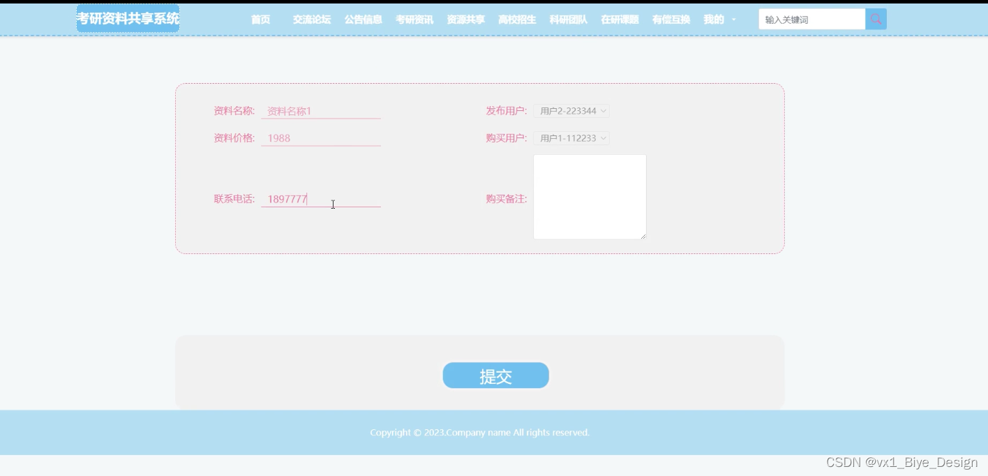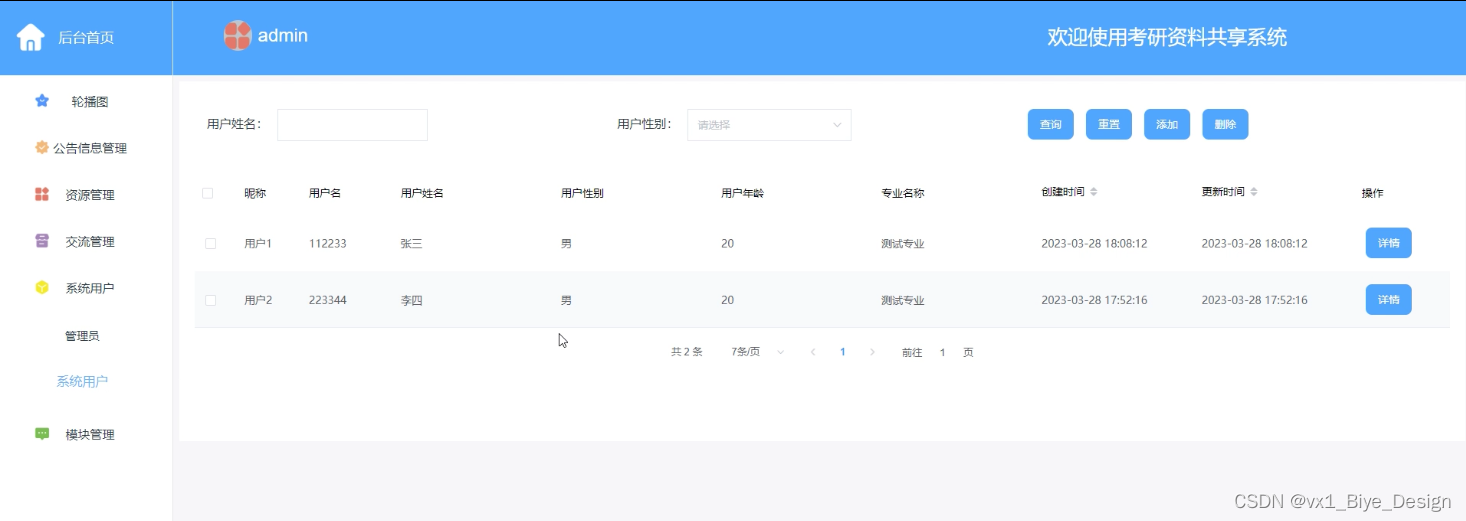 本设计主要实现集人性化、高效率、便捷等优点于一身的考研资料共享系统,完成首页、轮播图、公告信息、资源管理(考研资讯、资讯分类)交流管理(交流论坛、论坛分类)系统用户(管理员、系统用户)模块管理(资源共享、高校招生、科研团队、在研课题、有偿互换、购买记录)等功能模块。系统通过浏览器与服务器进行通信,实现数据的交互与变更。只需通过一台电脑,动动手指就可以操作系统,实现数据通信管理。整个系统的设计过程都充分考虑了数据的安全、稳定及可靠等问题,而且操作过程简单。本系统通过科学的管理方式、便捷的服务提高了工作效率,减少了数据存储上的错误和遗漏。