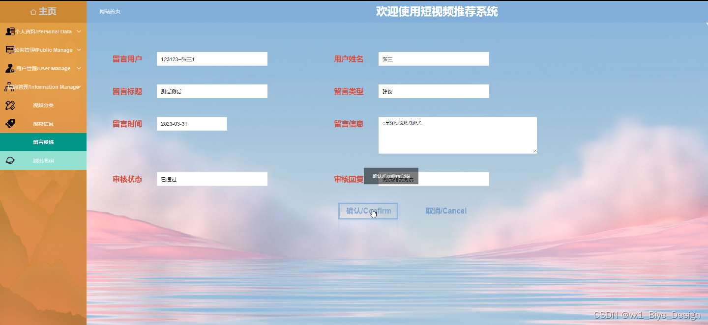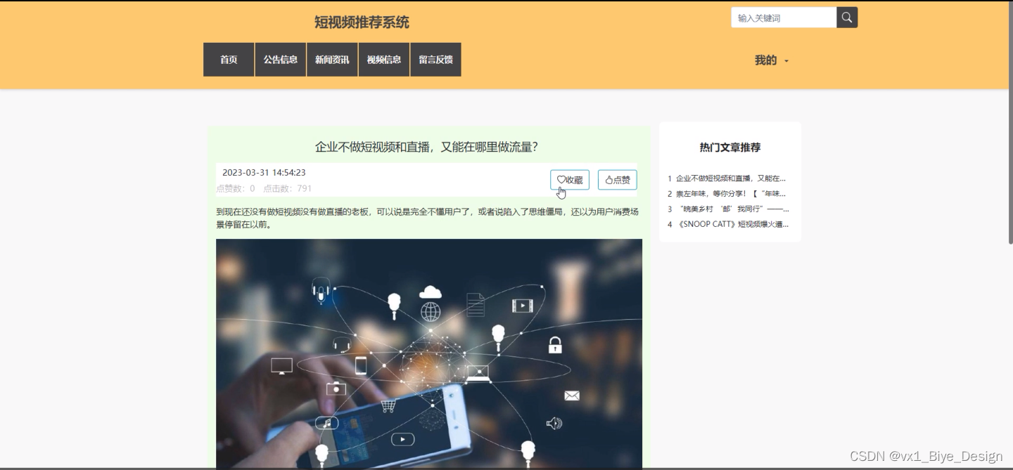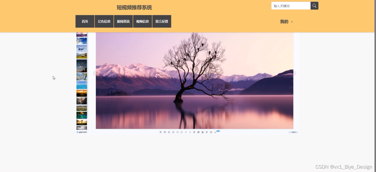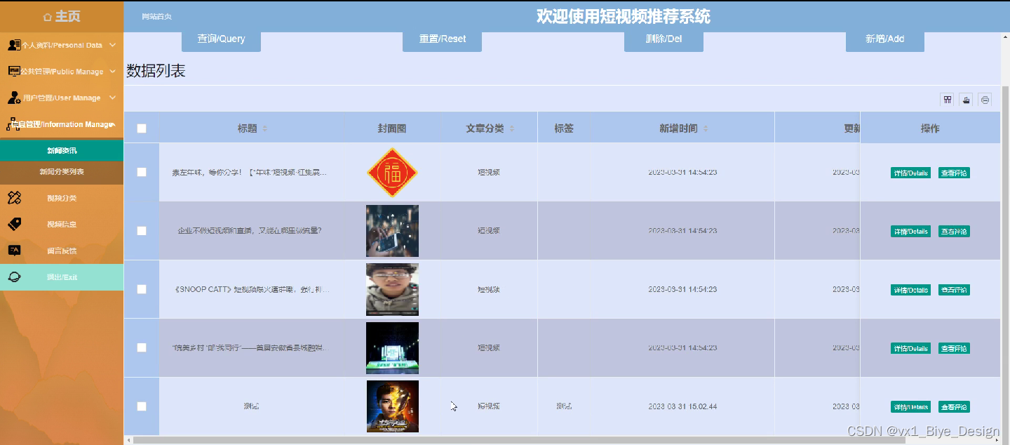 The system adopts a B/S structure, adopting a browser interactive mode for all business modules, selecting MySQL as the system database, and using SpringBoot as the development tool for system design. The main functional modules of the short video recommendation system have been basically implemented. This system has two main functional modules: administrator and user. The administrator includes the homepage, personal information, public management (such as broadcast images and announcement information), user management (such as administrators and ordinary users), information management (such as news information and news classification lists), video classification, video information, and message feedback; Users: Home page, message board, announcement information, news information, video information, message feedback, and other operations.