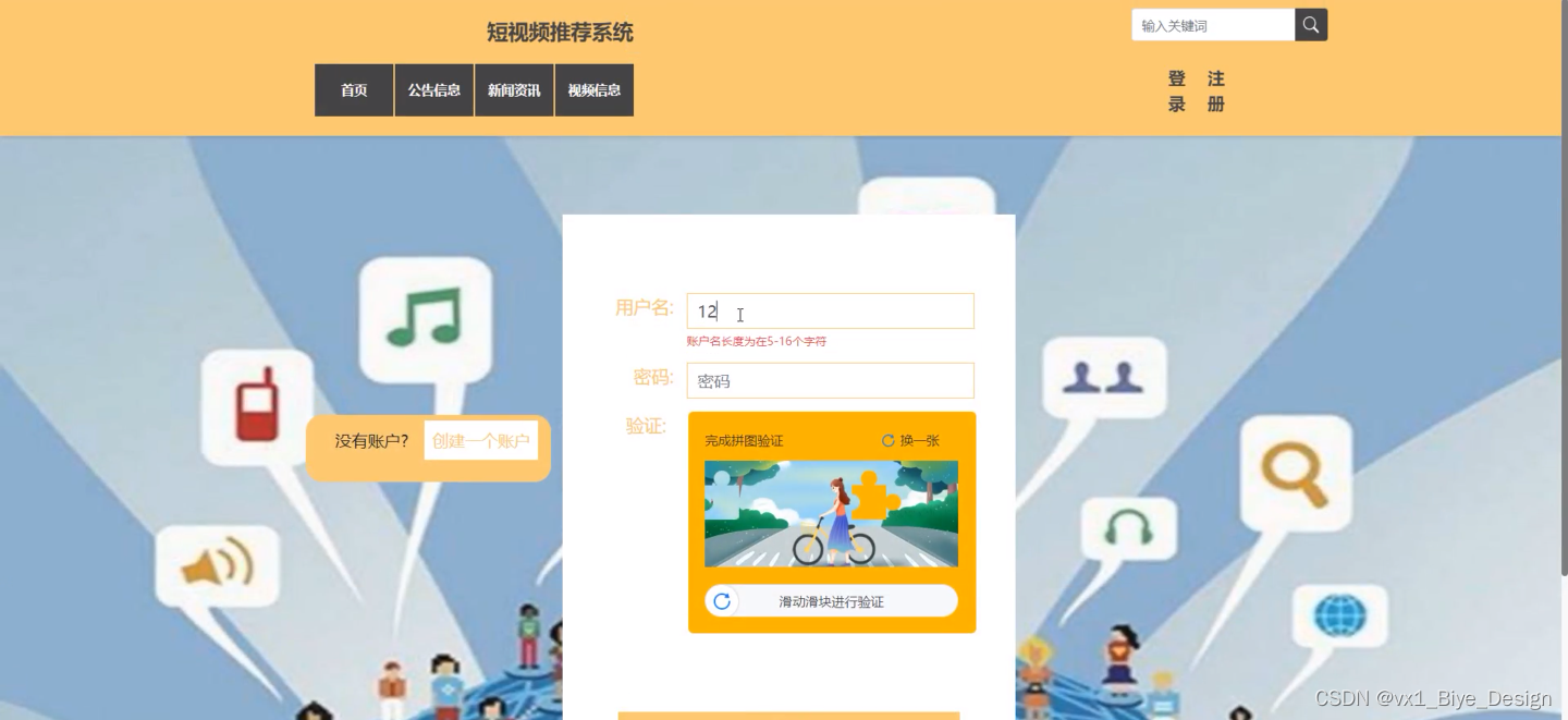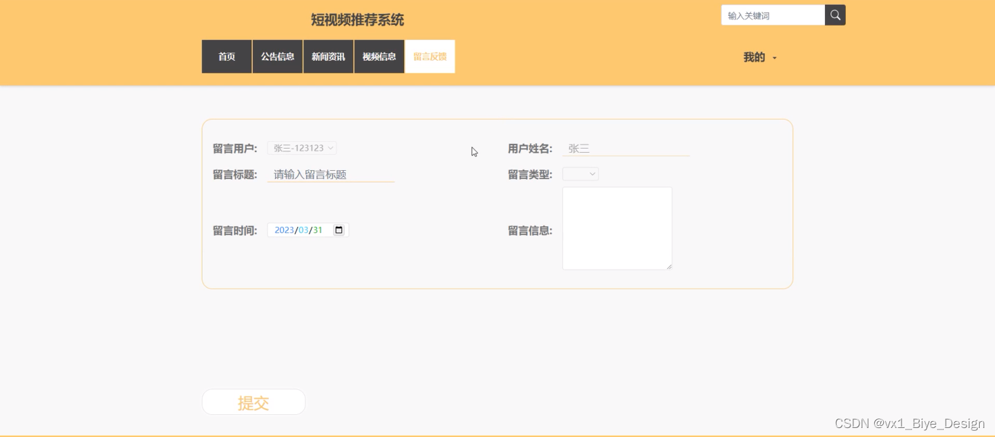 系统用户登录短视频推荐系统,功能为:首页,公告信息,新闻资讯,视频信息,留言反馈,我的等功能,如下图所示: