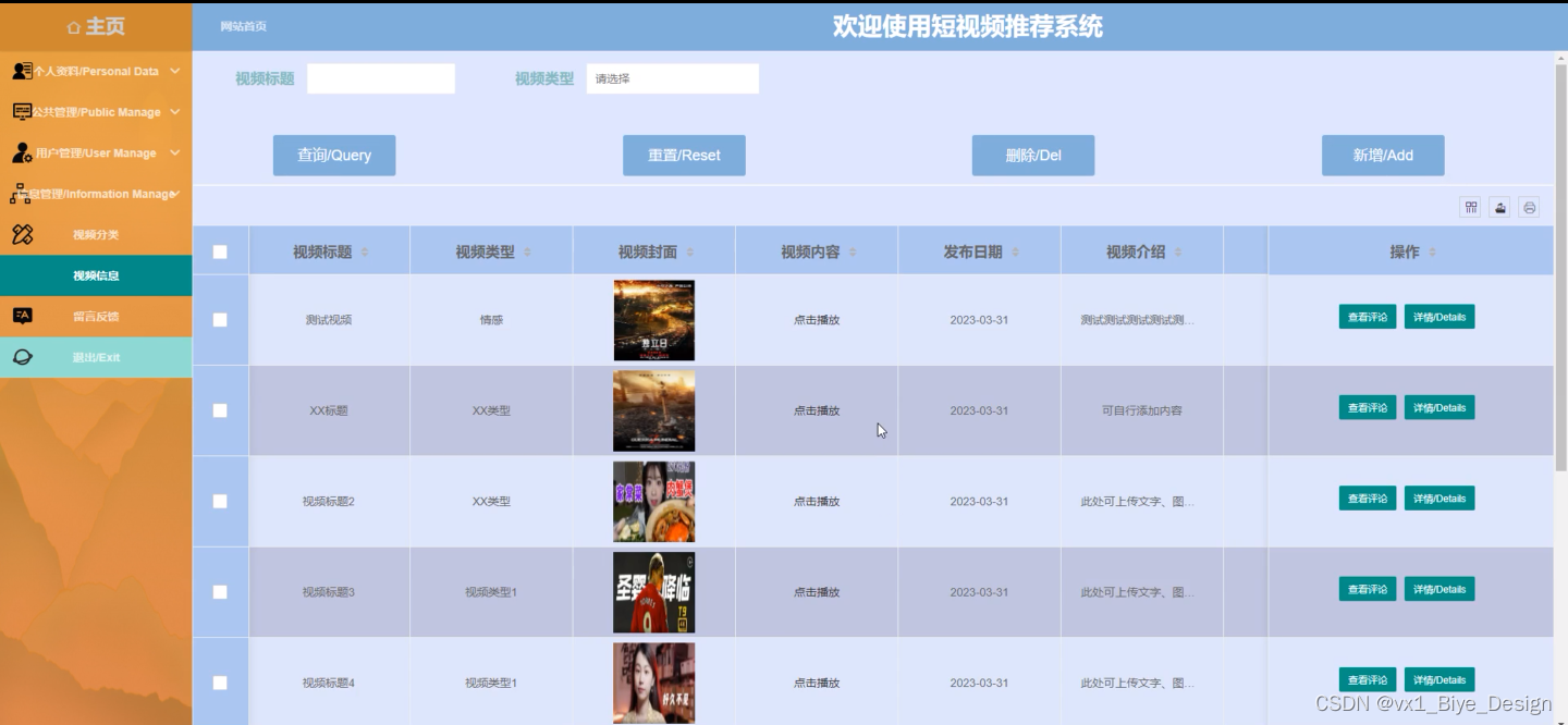 视频信息,在此界面可查看视频标题、类型、内容、介绍、视频封面、发布日期等信息,还可在此页面进行详情,查看评论,重置,删除,添加等操作,如下图所示: