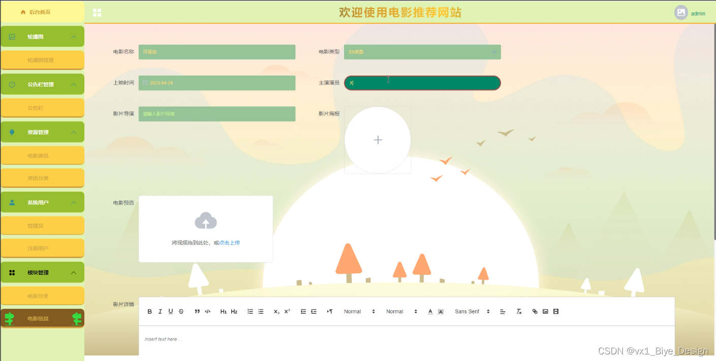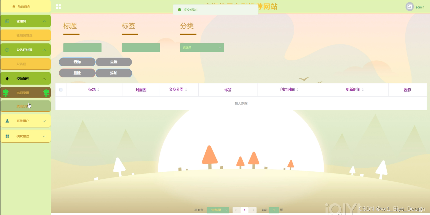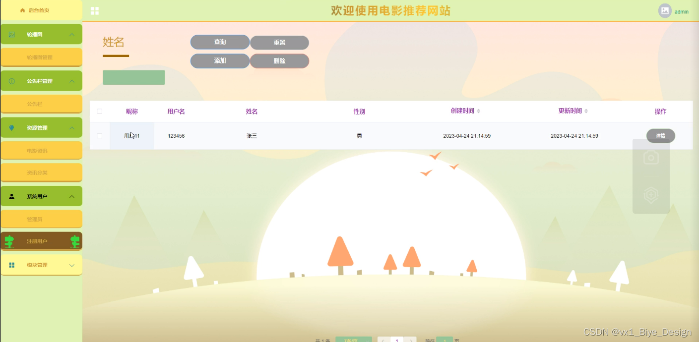 系统设计主要是管理员登录后对整个系统相关操作进行处理,可进行管理员的添加和删除,首页、轮播图(轮播图管理)、公告栏管理(公告栏)、资源管理(电影资讯、资讯分类)、系统用户(管理员、注册用户)、模块管理(电影分类、电影信息)、个人中心等操作管理。