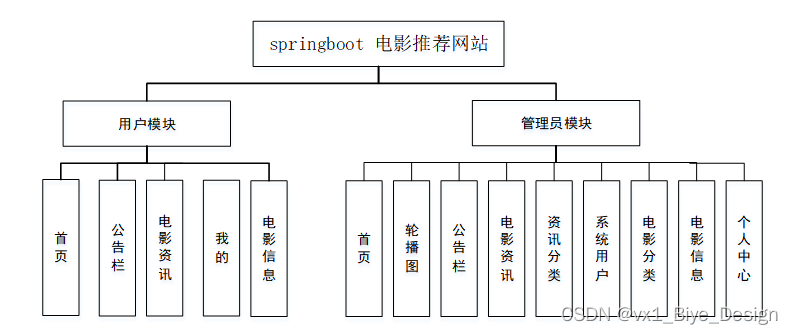本系统主要包含了首页、轮播图(轮播图管理)、公告栏管理(公告栏)、资源管理(电影资讯、资讯分类)、系统用户(管理员、注册用户)、模块管理(电影分类、电影信息)、个人中心等多个功能。不同的权限对应相应的功能模块的需求,管理员权限的级别是最高的,所以所对应的需求是最多的。