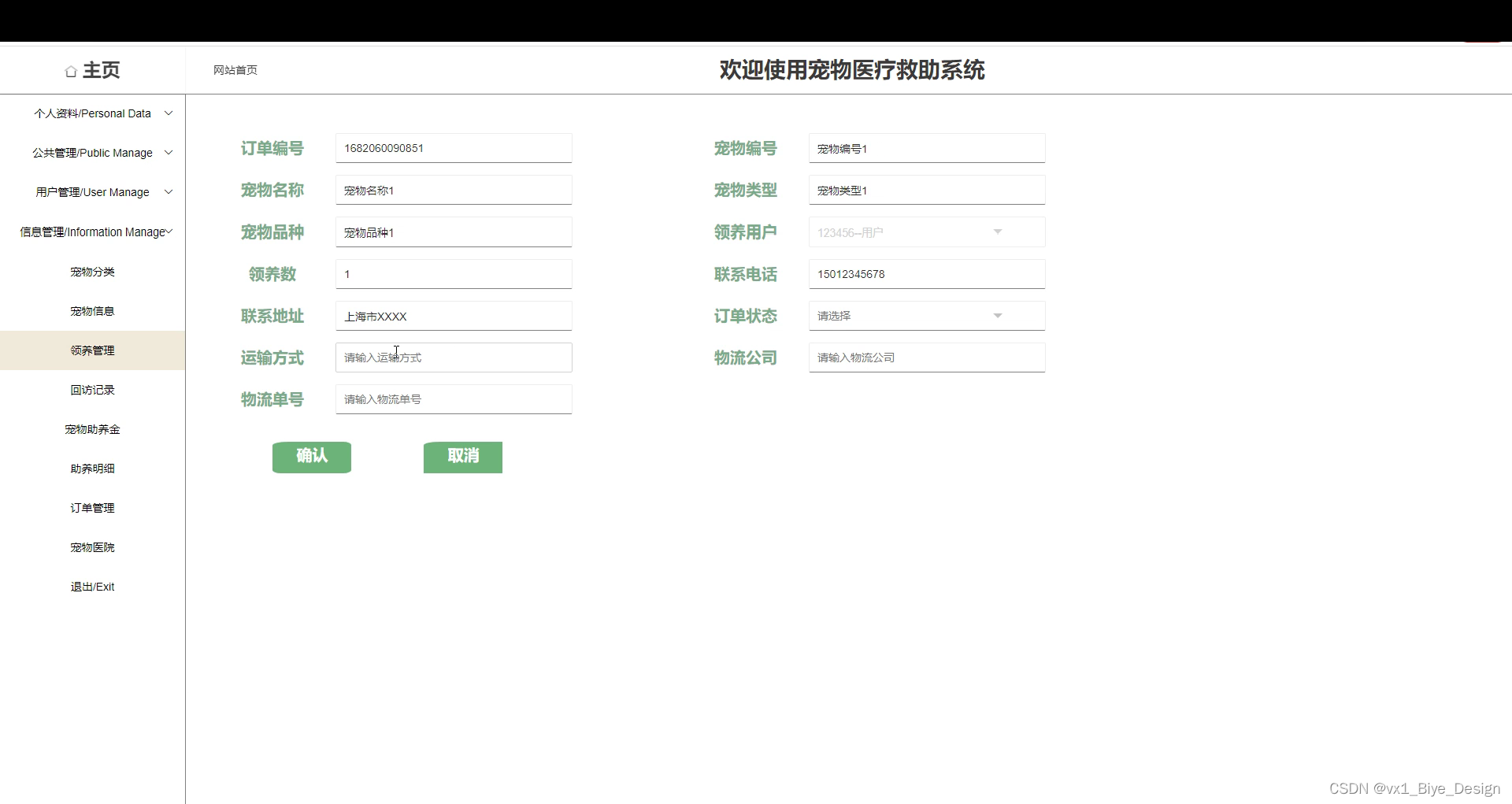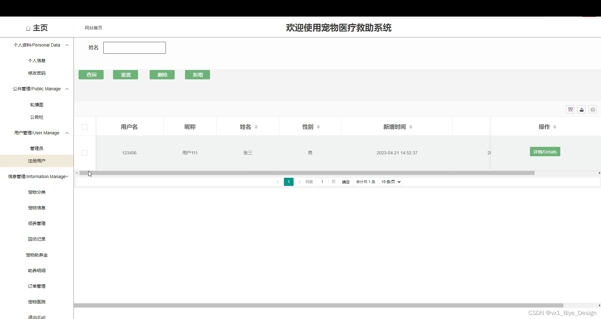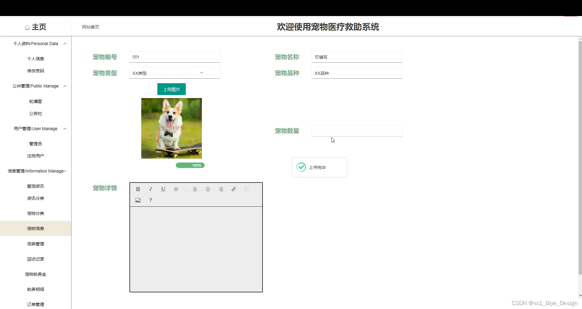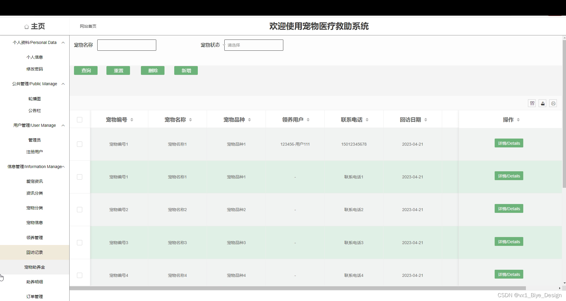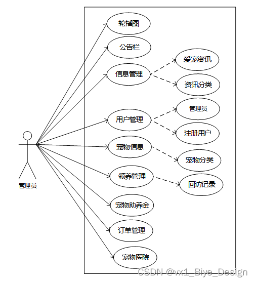 (1)功能要求:可以管理个人资料、公共管理(轮播图、公告栏)、用户管理(管理员、注册用户)、信息管理(爱宠资讯、资讯分类)、宠物分类、宠物信息、领养管理、回访记录、宠物助养金、订单管理、宠物医院等功能模块。